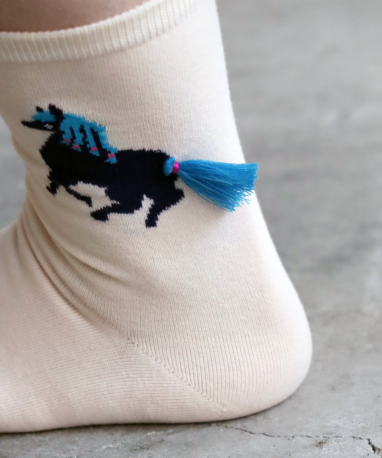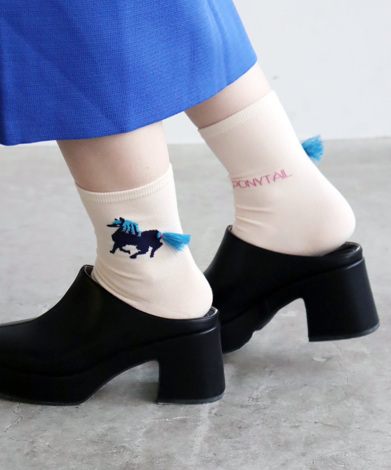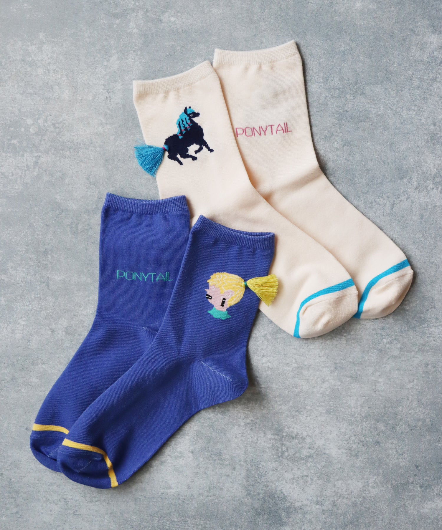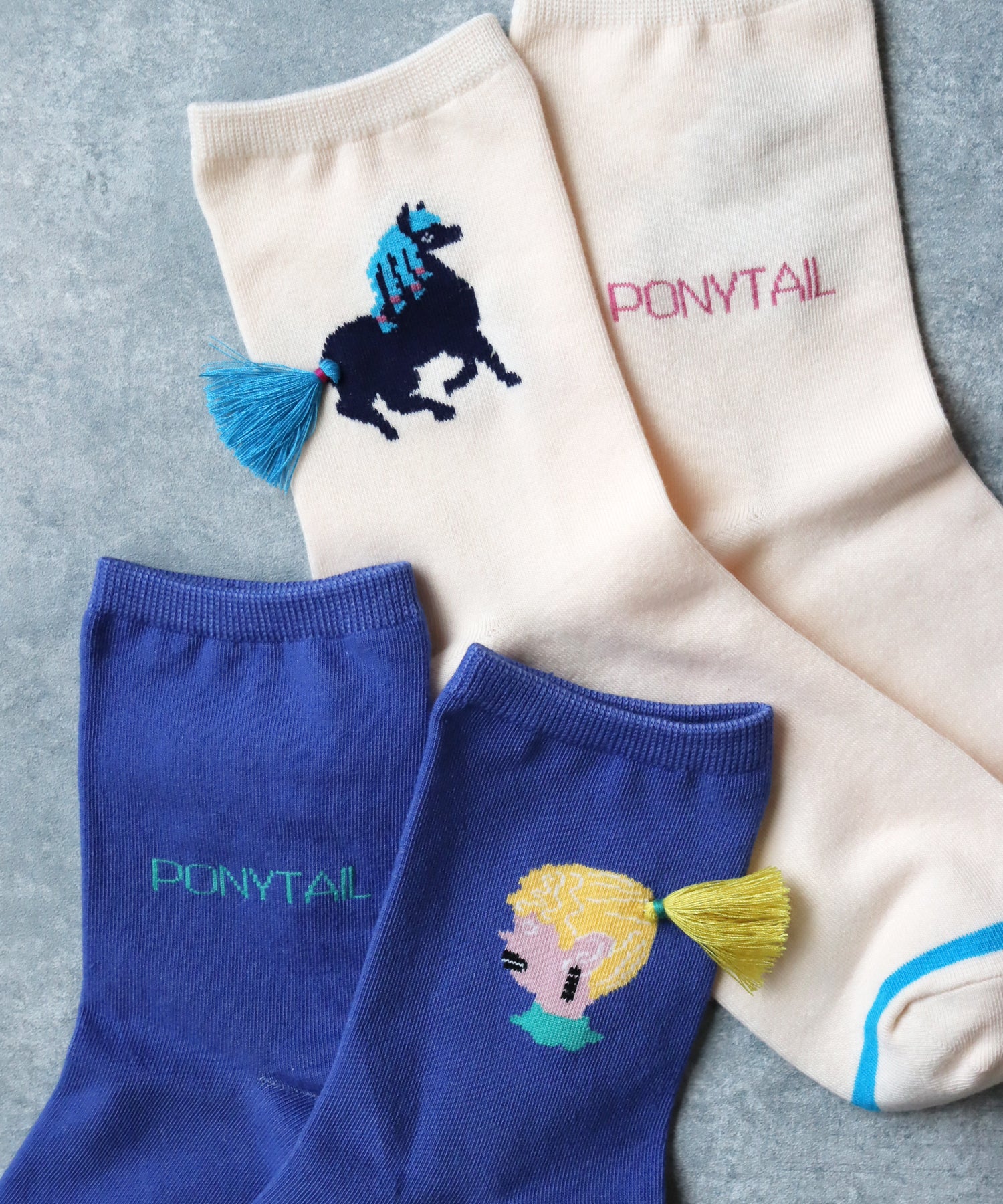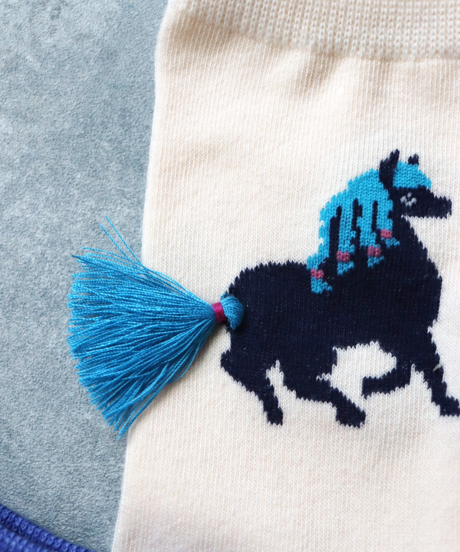 女の子の髪型のポニーテールと、馬のしっぽのポニーテール、タッセルになって足もとでゆらり。遊び心あふれるソックスできました。