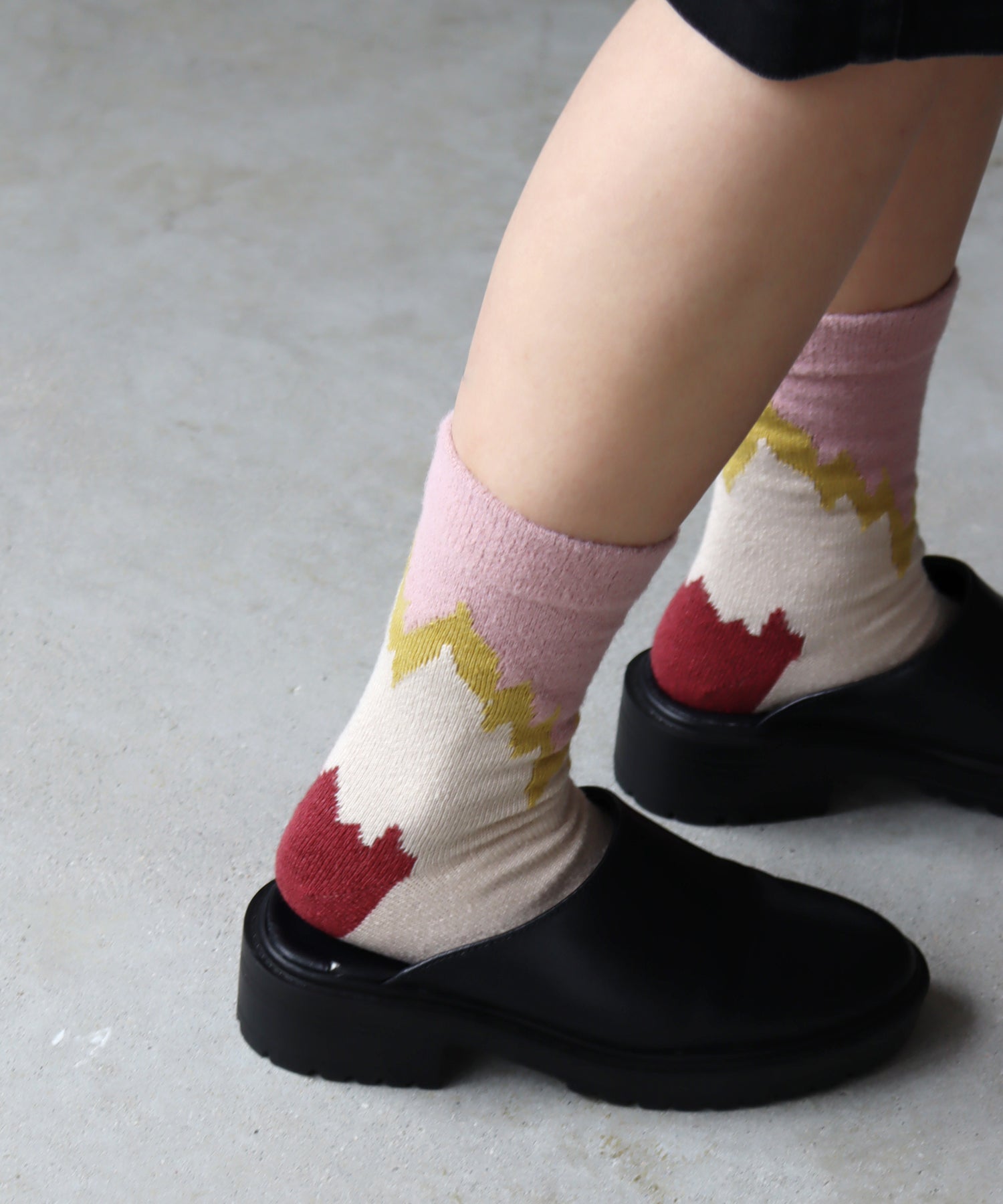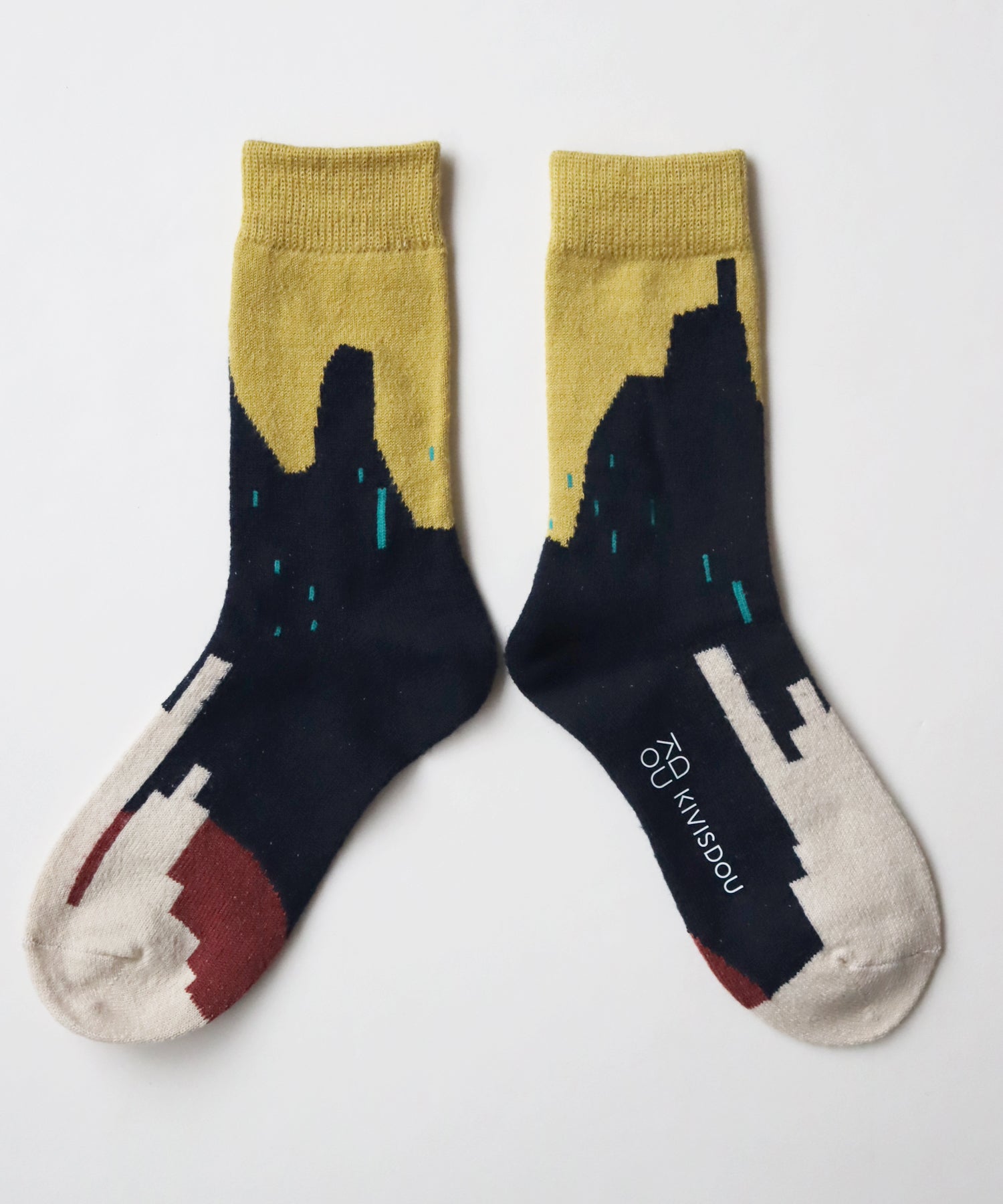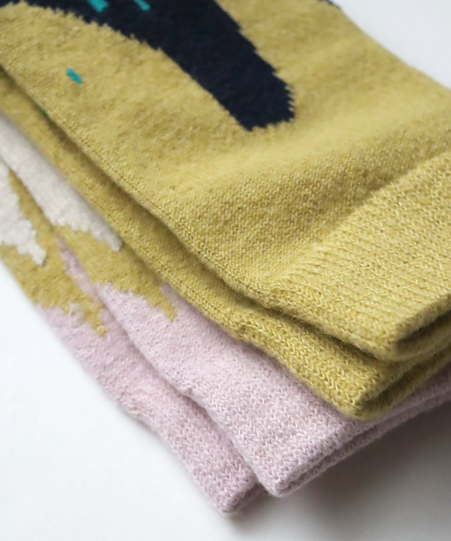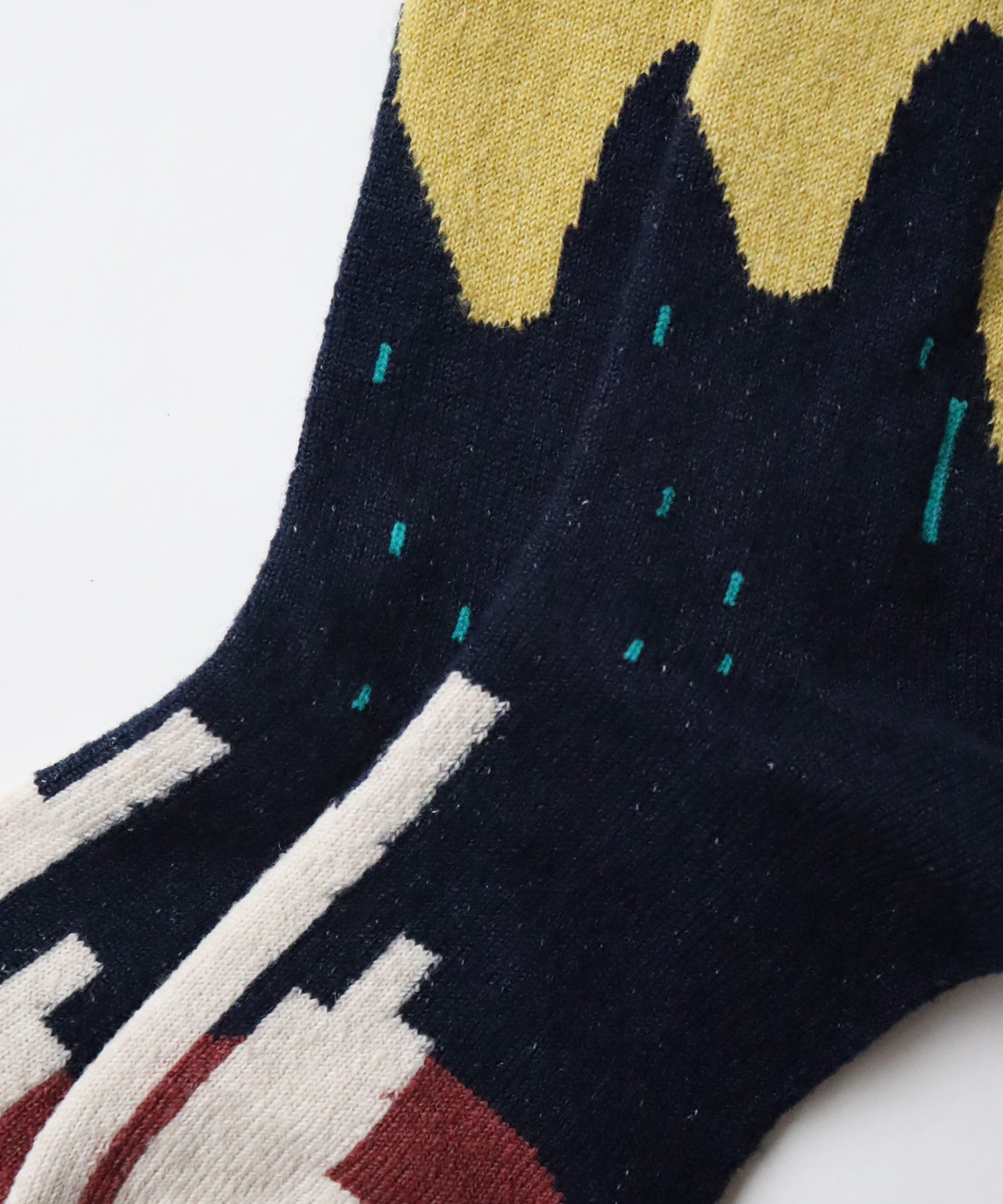 北極圏の風景は、厳しい自然環境と独特の美しさが融合した魅力的な場所。その美しさをテーマにデザインされたソックスです。糸にはフワっとした風合いのものを使用。北極圏という寒い場所を温かい素材感で表現したところも面白い。