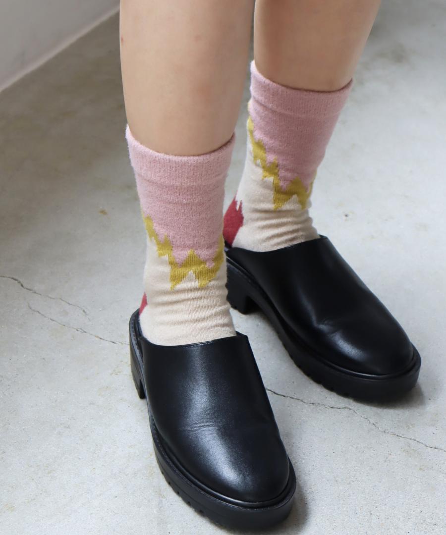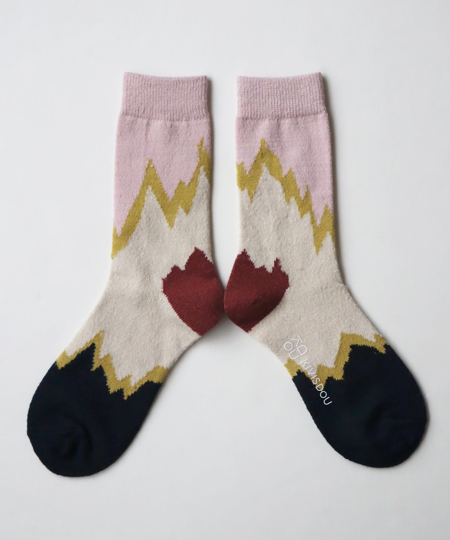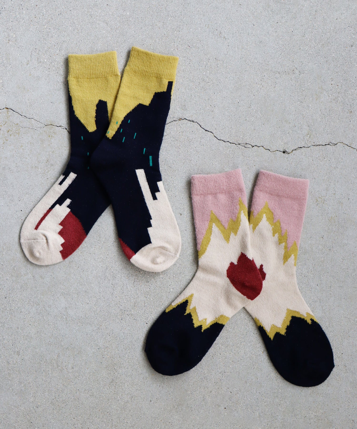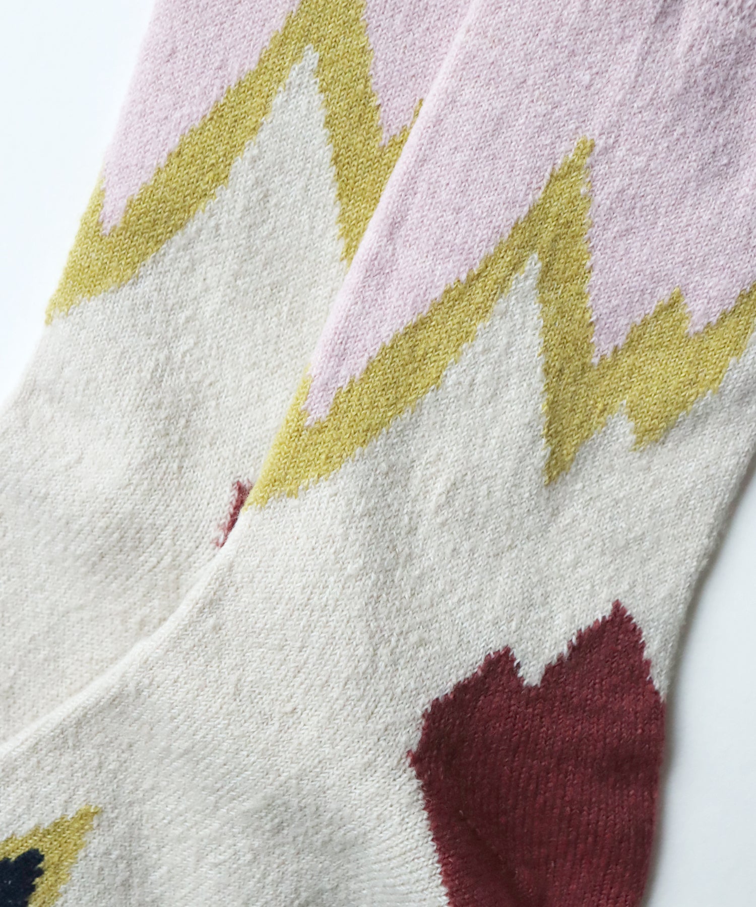 北極圏の風景は、厳しい自然環境と独特の美しさが融合した魅力的な場所。その美しさをテーマにデザインされたソックスです。糸にはフワっとした風合いのものを使用。北極圏という寒い場所を温かい素材感で表現したところも面白い。