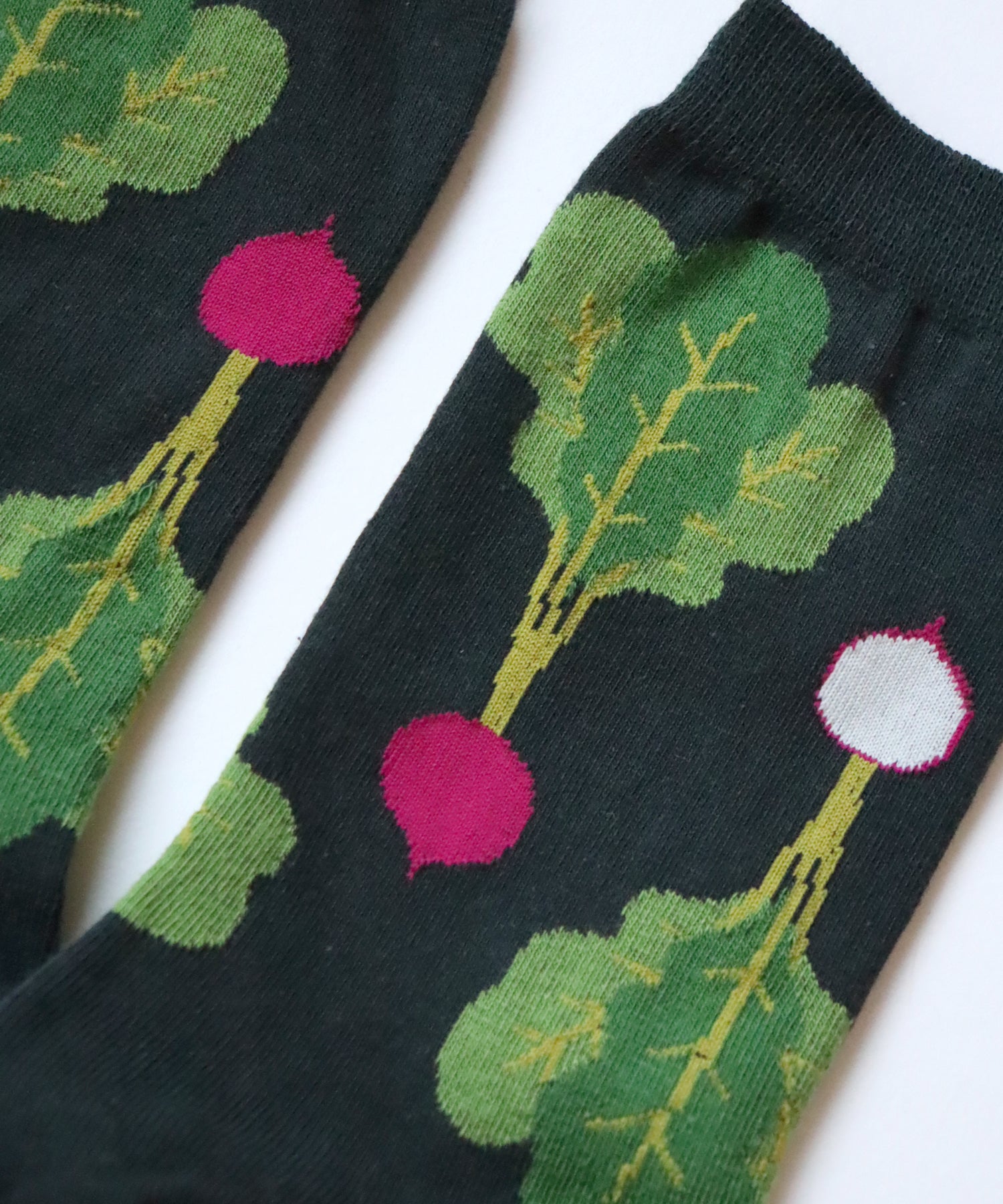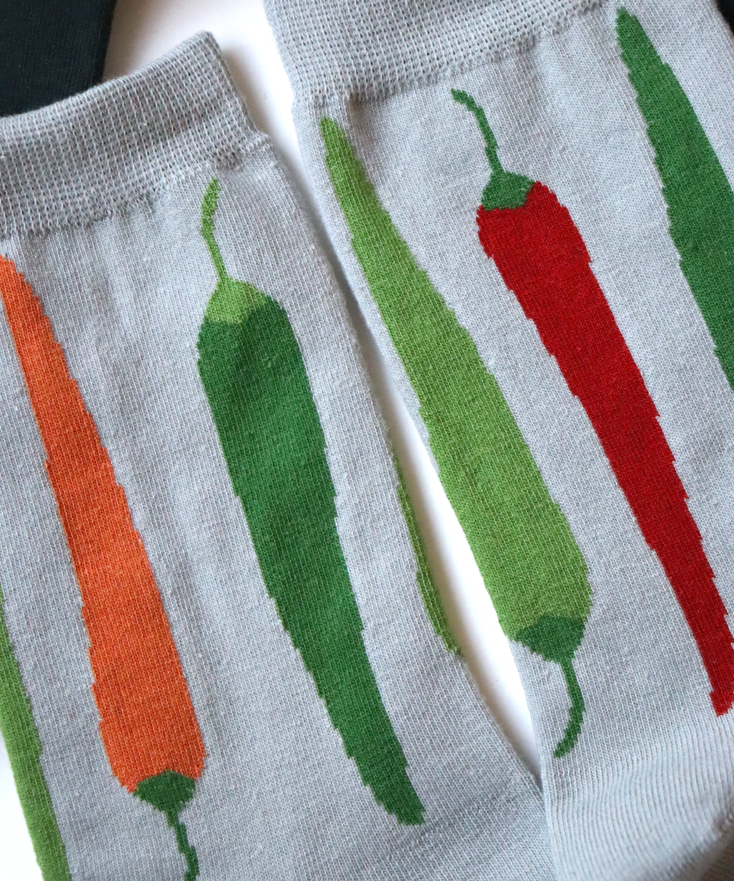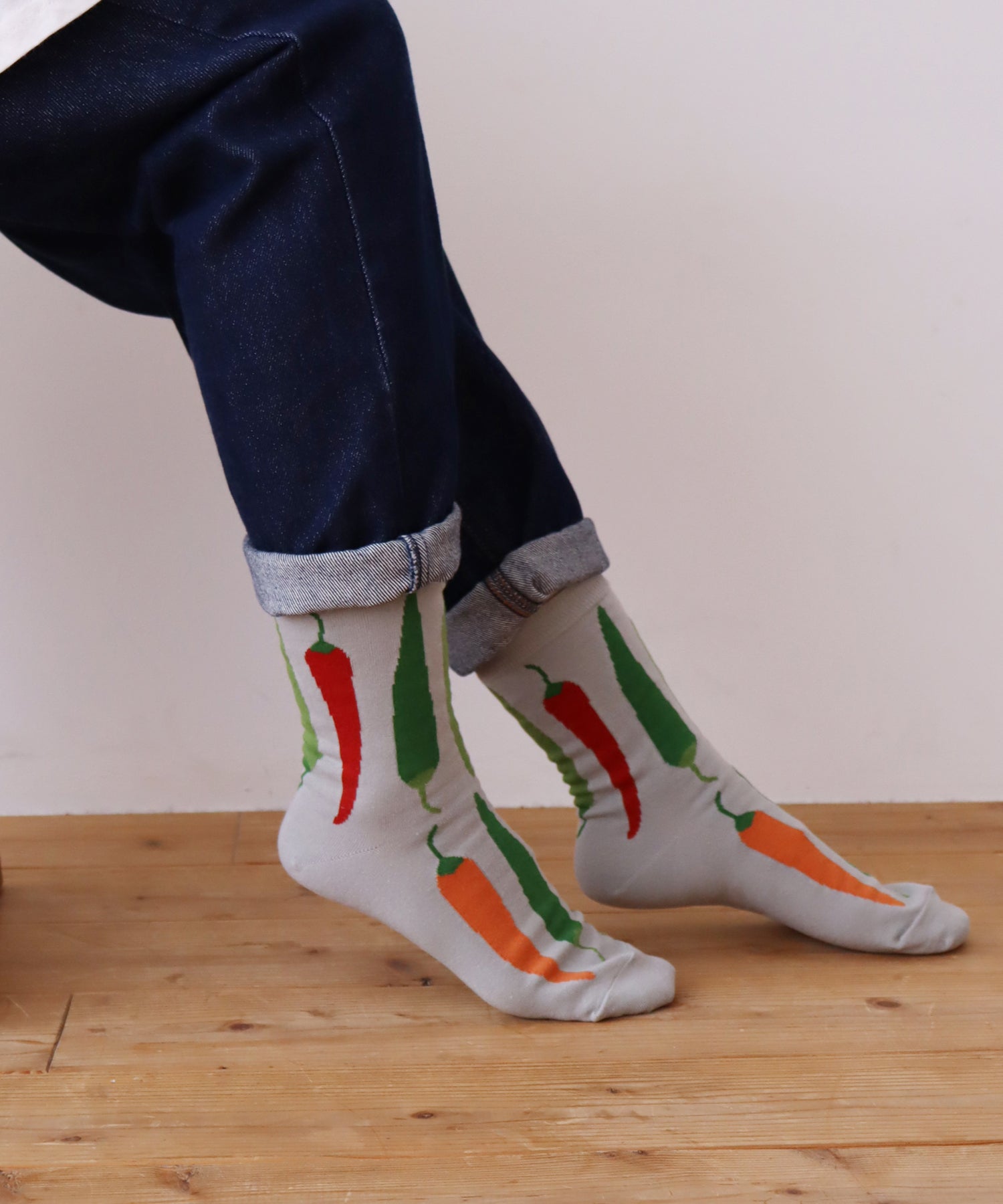 元気が出るトウガラシと、可愛らしいラディッシュを散りばめた遊び心たっぷりの靴下。肌に優しい綿糸で編まれているから、毎日でも履きたくなる心地よさ。