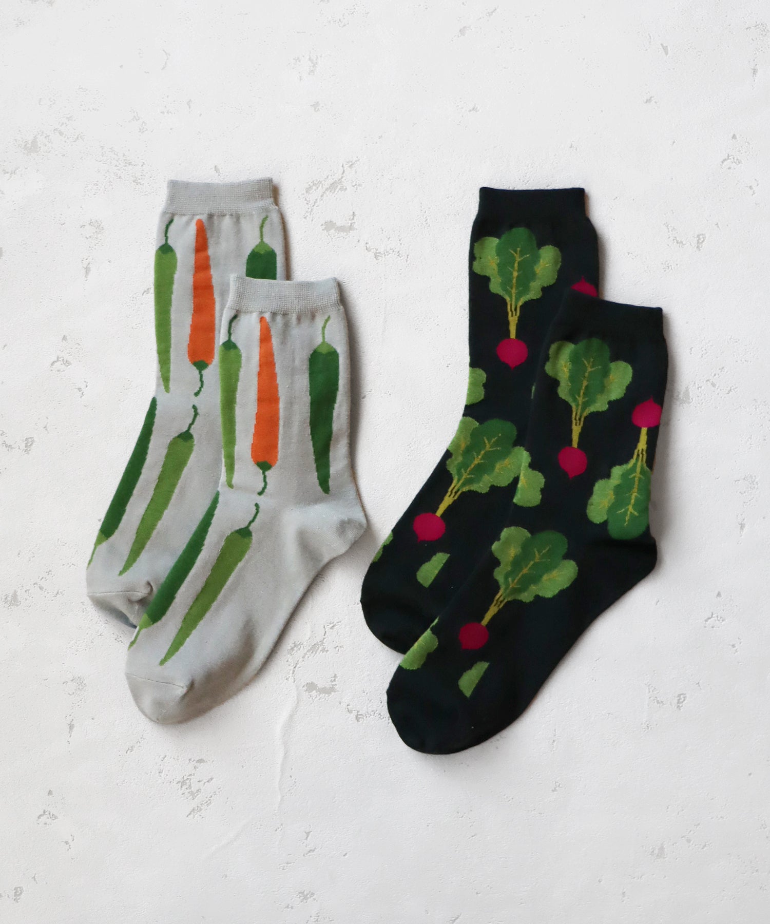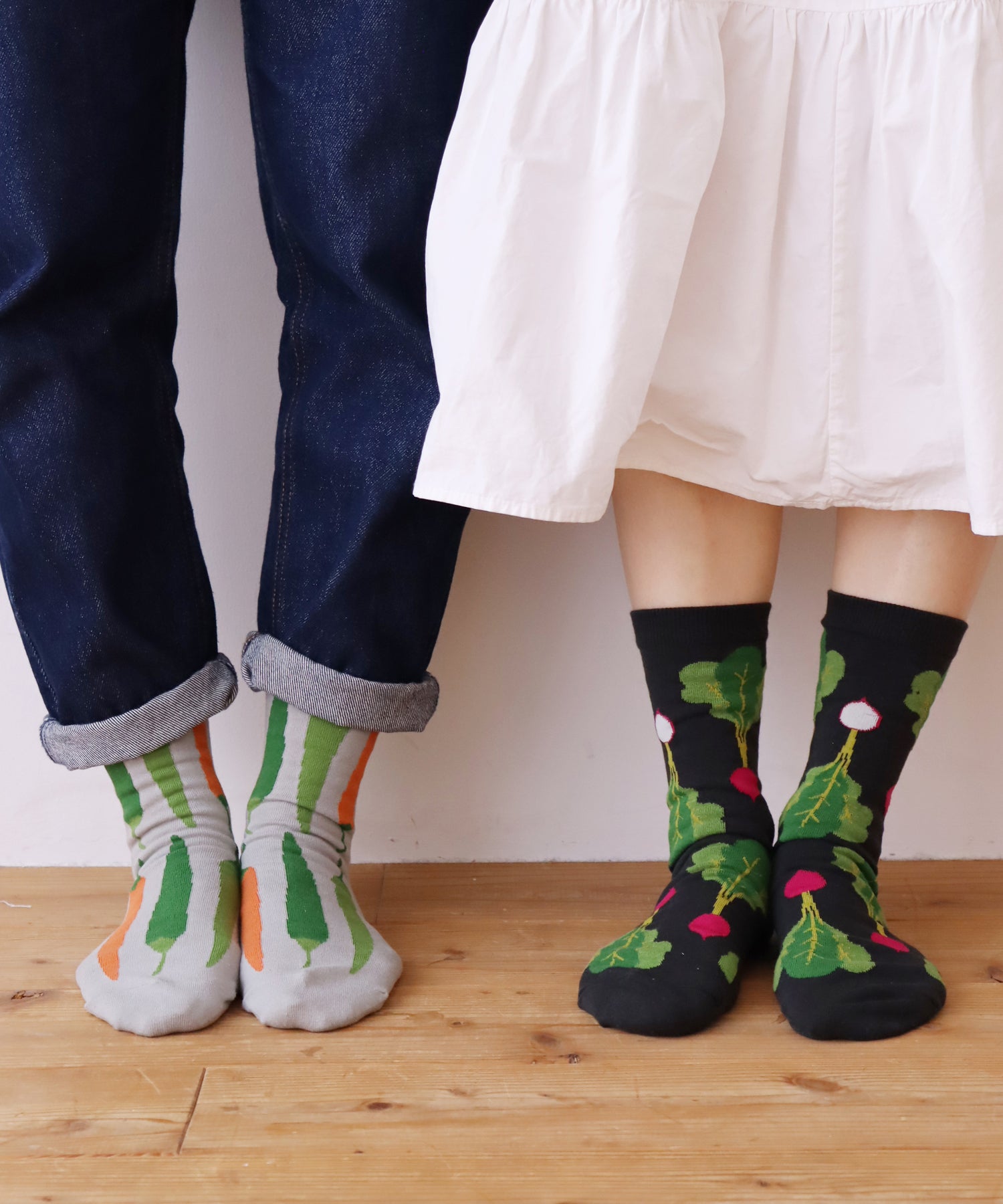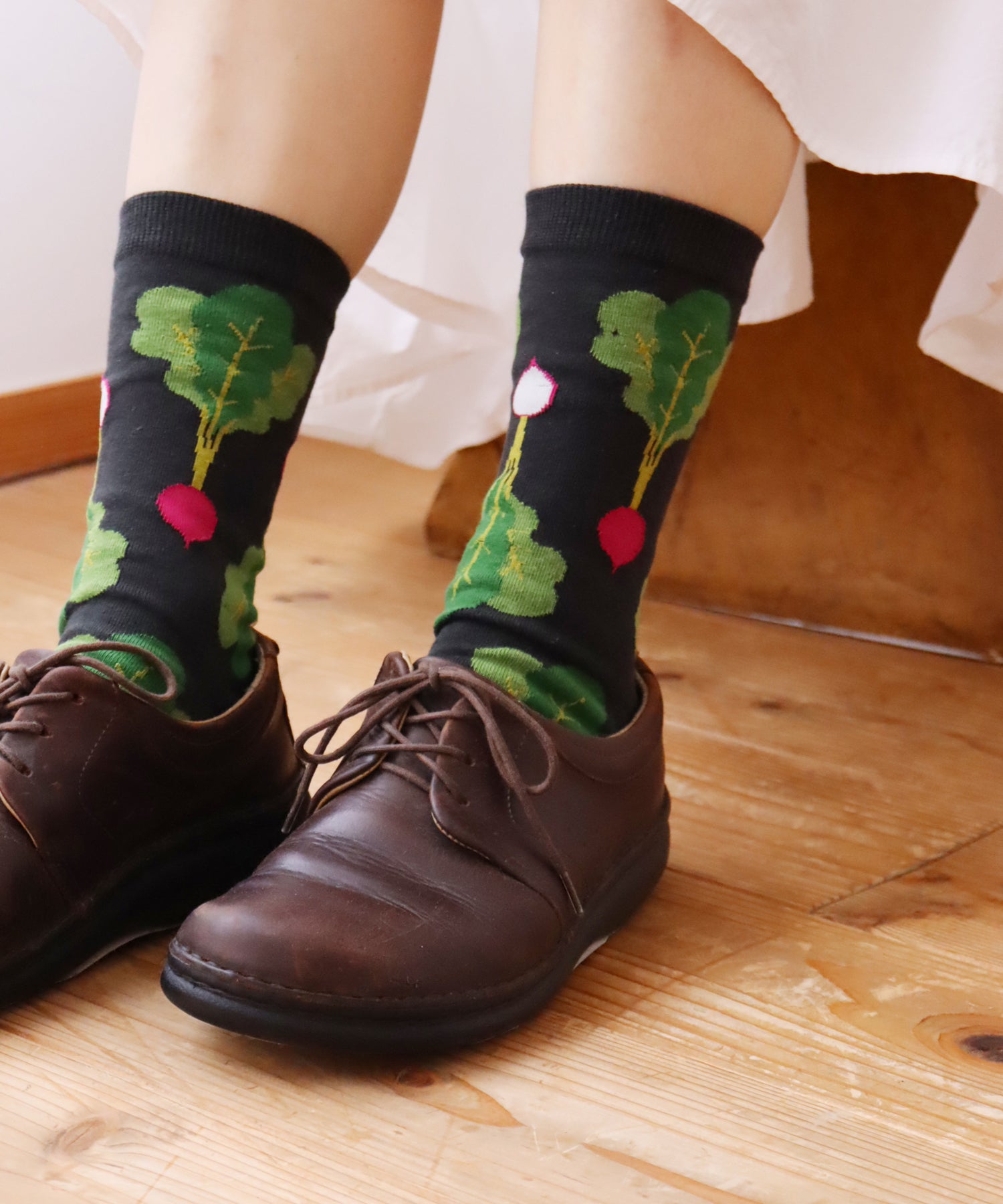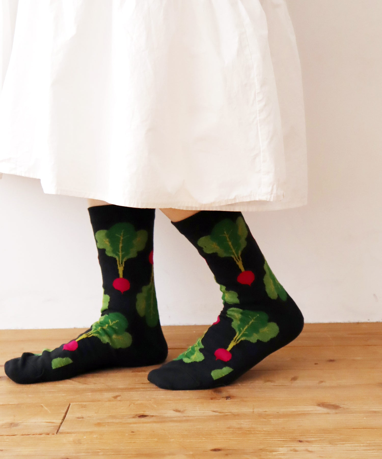 元気が出るトウガラシと、可愛らしいラディッシュを散りばめた遊び心たっぷりの靴下。肌に優しい綿糸で編まれているから、毎日でも履きたくなる心地よさ。