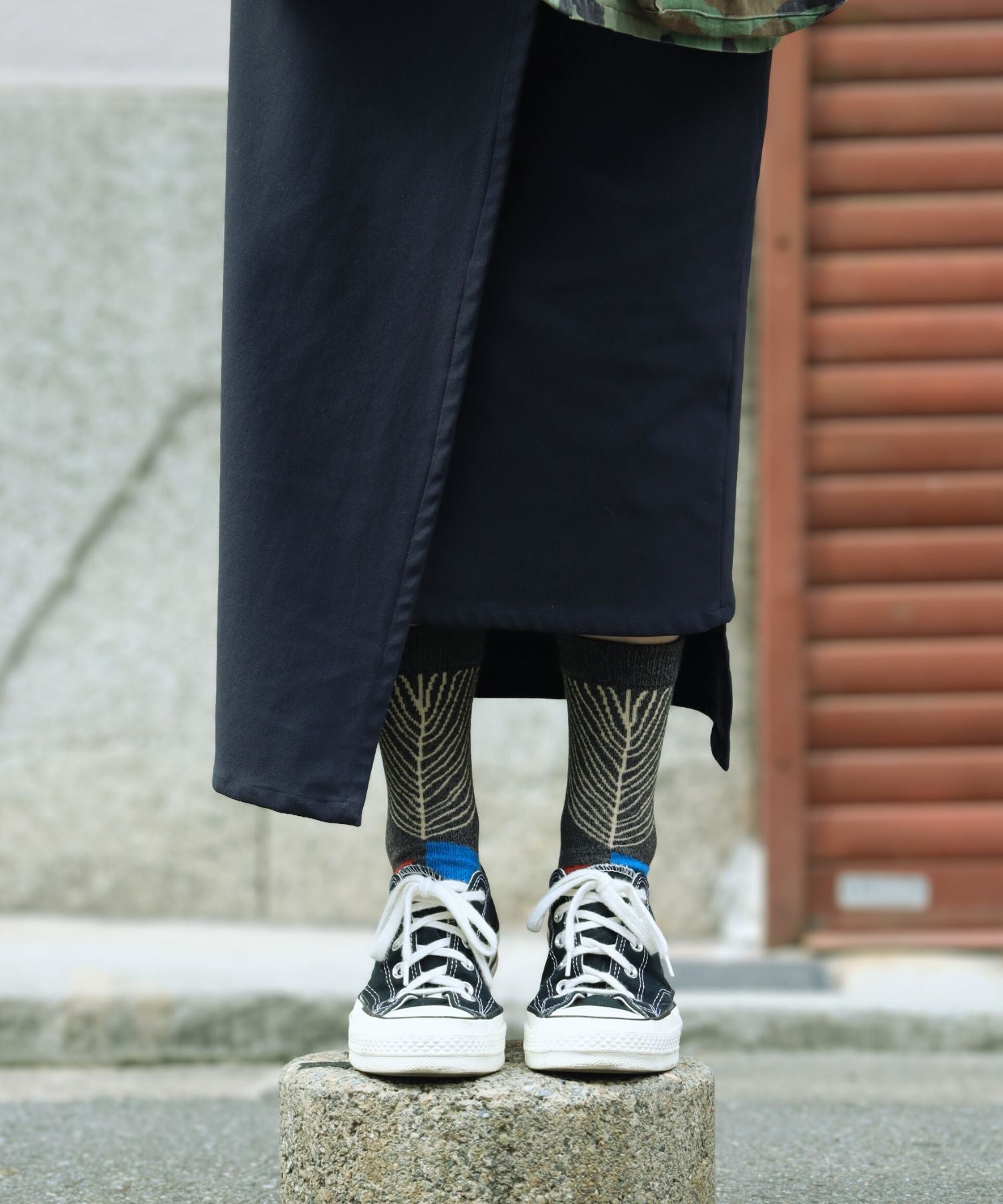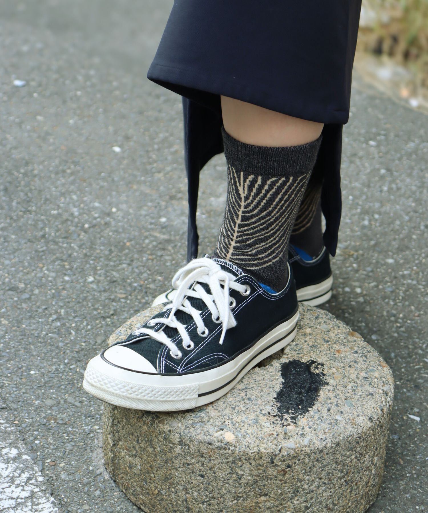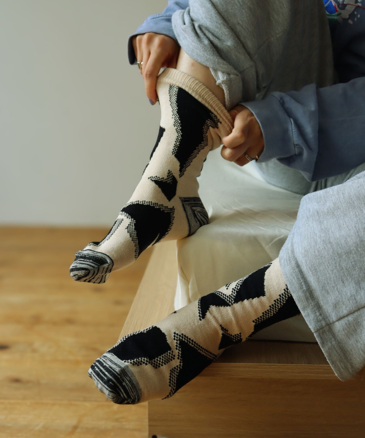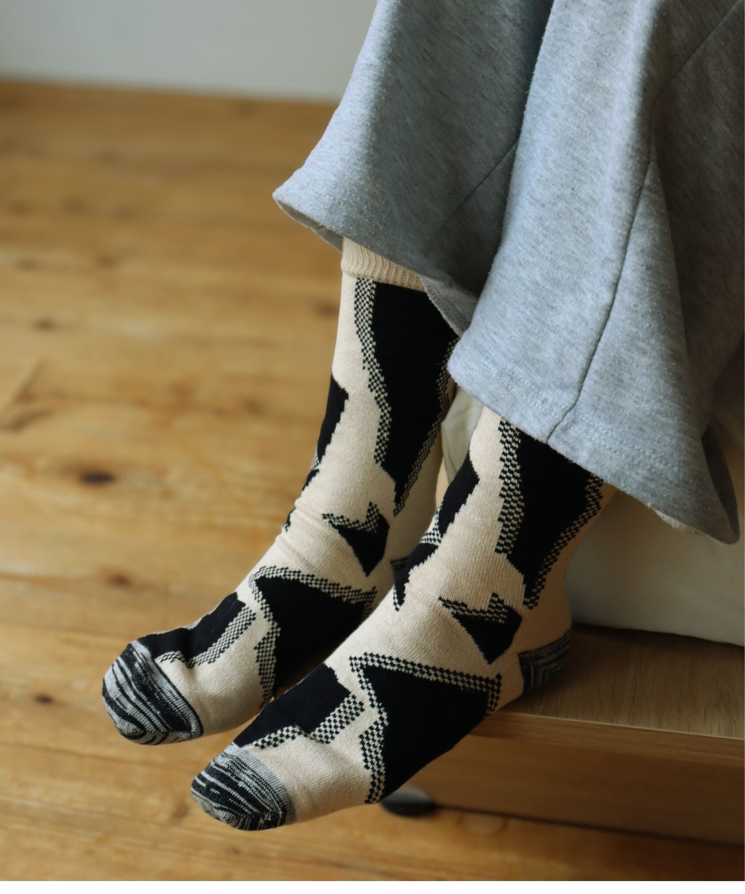 ラグのような温かみのあるミドルゲージソックス。フォークロア風の柄が、シンプルな装いにもさりげないアクセントを添えます。ほどよい厚みで足元を包み込み、ナチュラルな雰囲気と上品な個性を両立。普段のコーディネートにそっと彩りを加える、大人のための一足です。