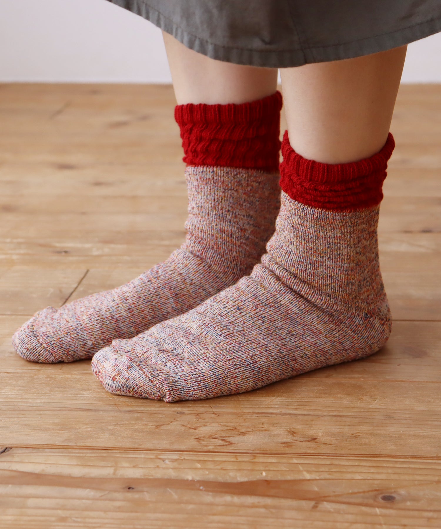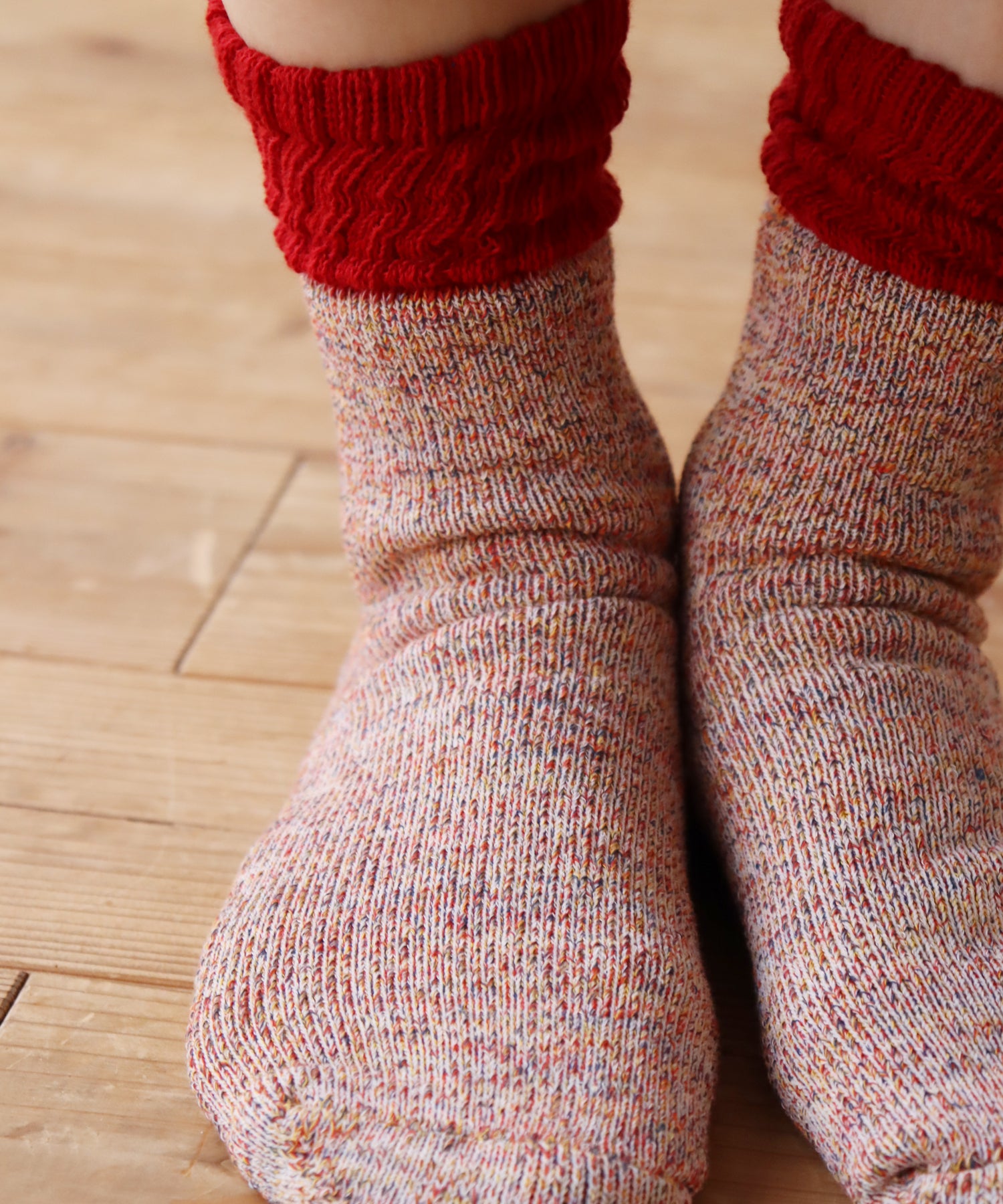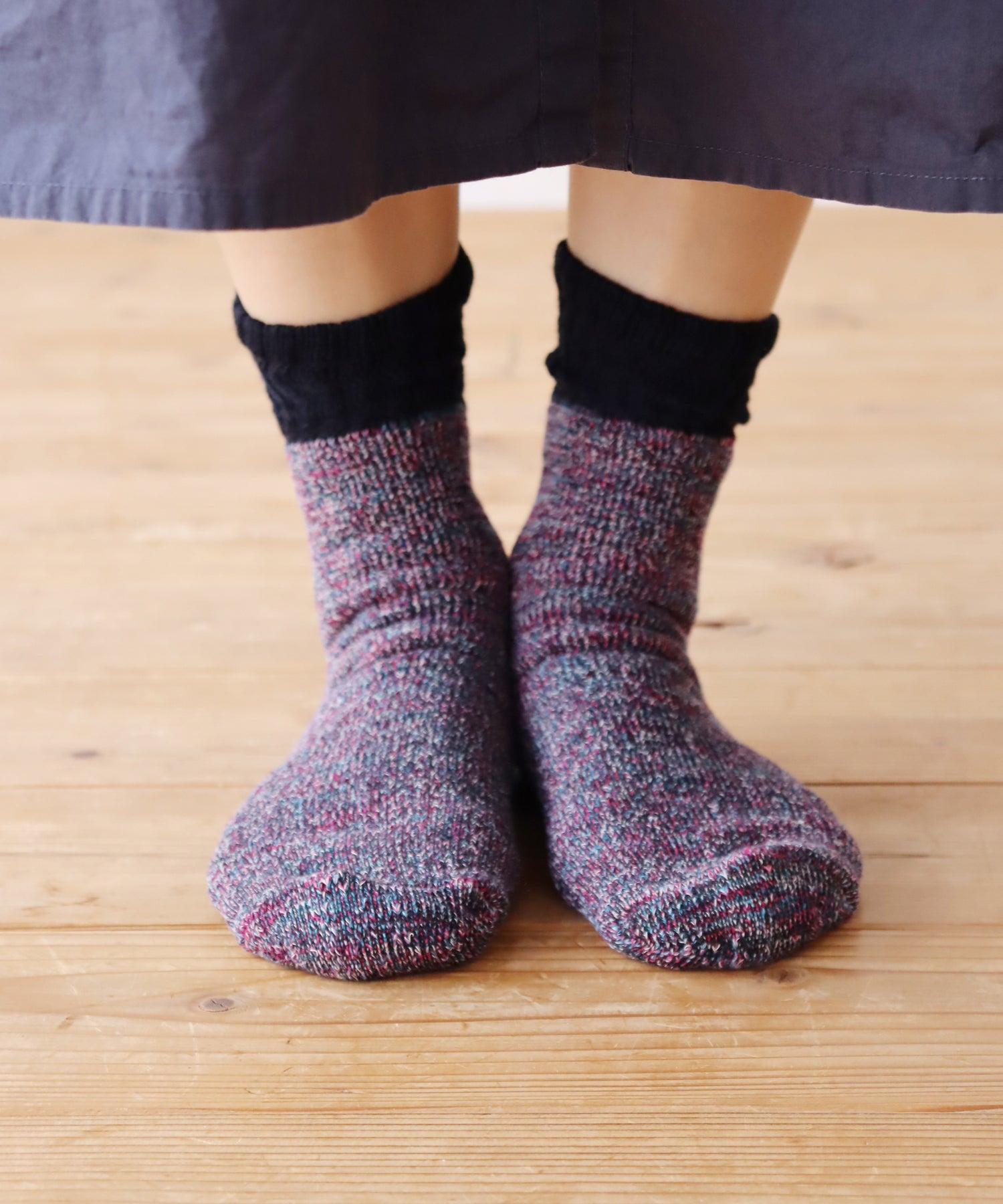 履き口は柔らかいリブ編みで仕上げ、足首にやさしくフィット。パイル部分の糸は**綿100%**で、ふんわり柔らかく肌触り抜群◎いろんな色の糸で編まれているので、どんなコーディネートにも自然になじみます。冷えやすい季節も、足元から包まれる暖かさで快適に。シンプルだけど贅沢な履き心地は、毎日のルームウェアやギフトにもおすすめです。