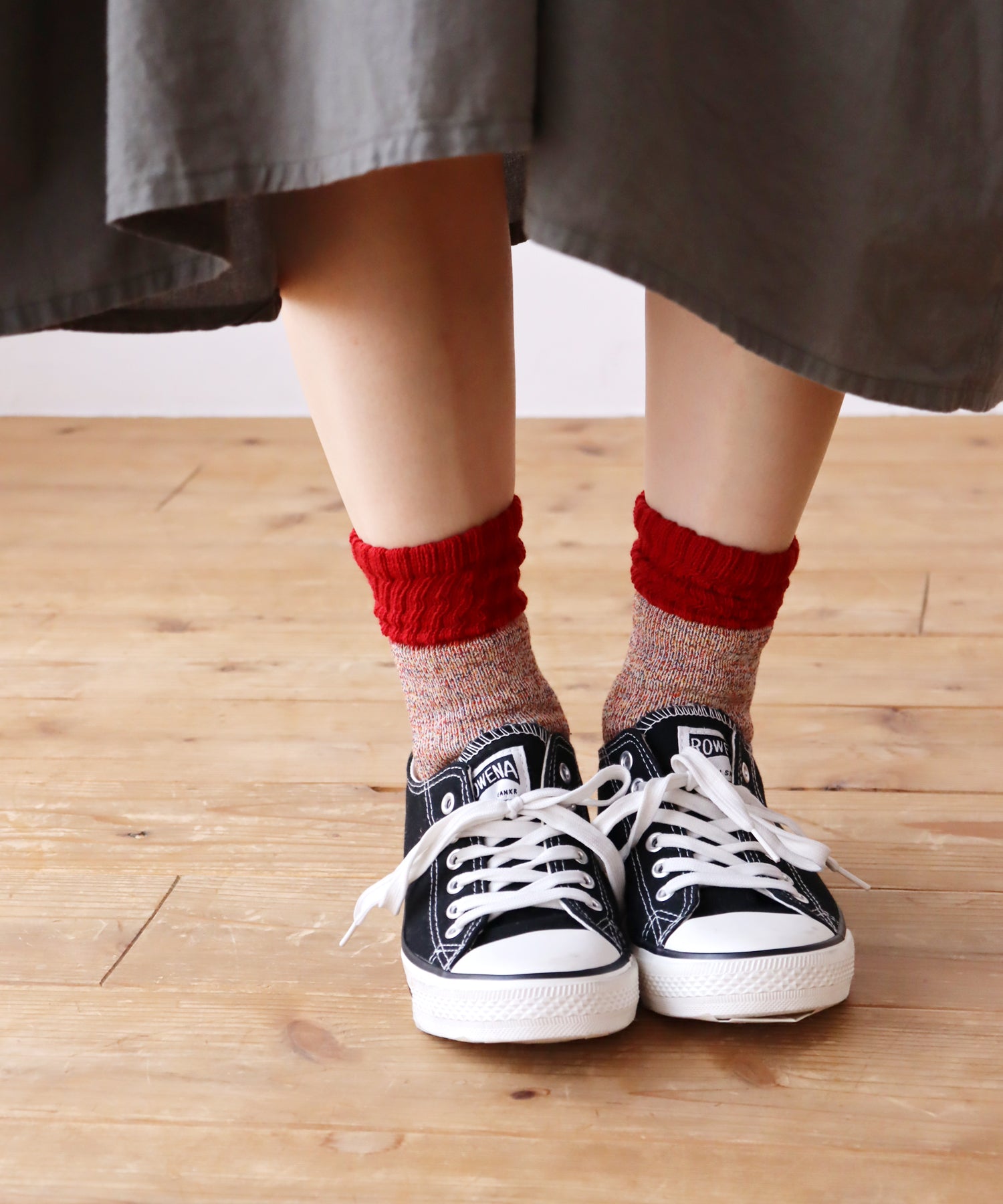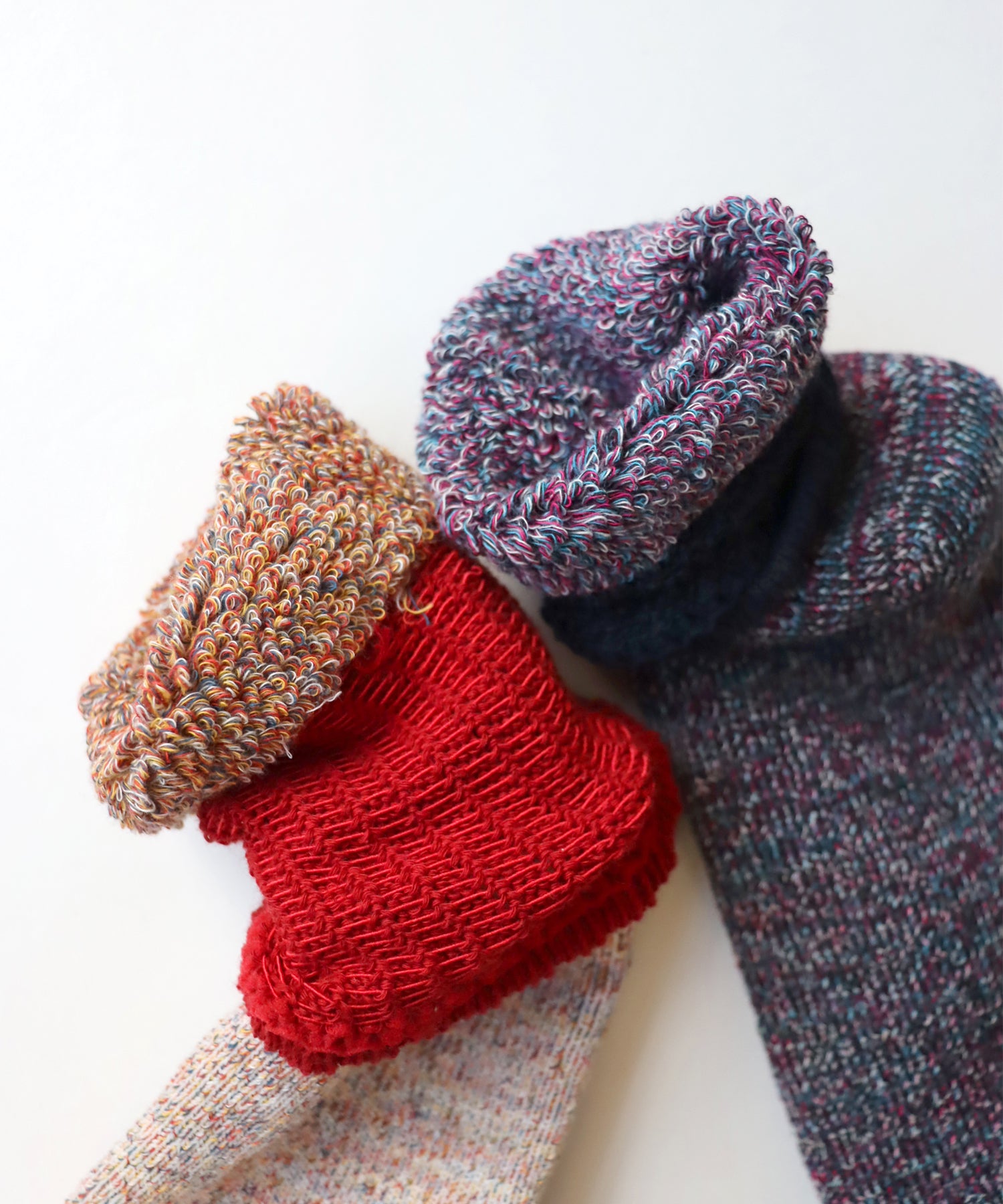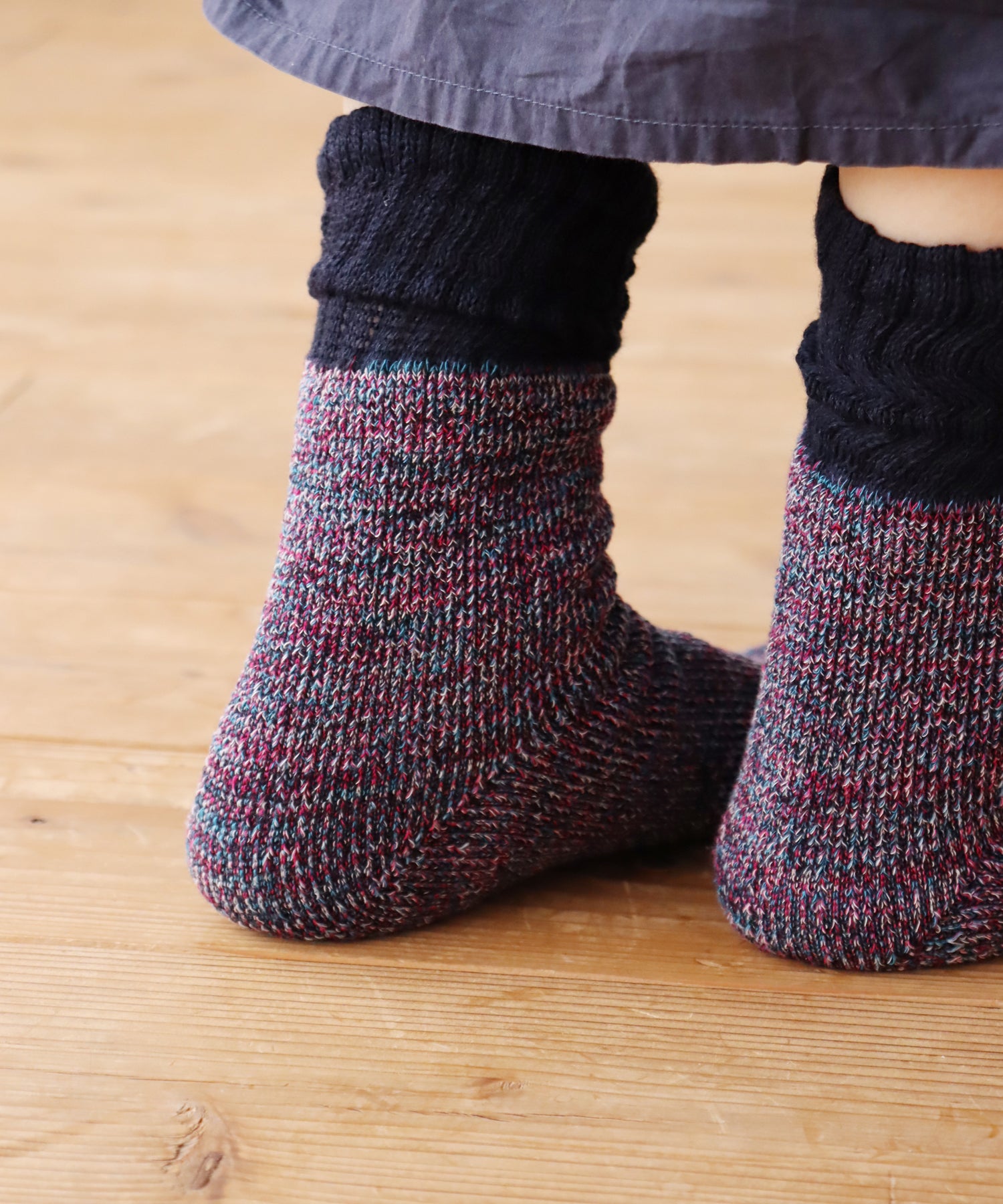 履き口は柔らかいリブ編みで仕上げ、足首にやさしくフィット。パイル部分の糸は**綿100%**で、ふんわり柔らかく肌触り抜群◎いろんな色の糸で編まれているので、どんなコーディネートにも自然になじみます。冷えやすい季節も、足元から包まれる暖かさで快適に。シンプルだけど贅沢な履き心地は、毎日のルームウェアやギフトにもおすすめです。