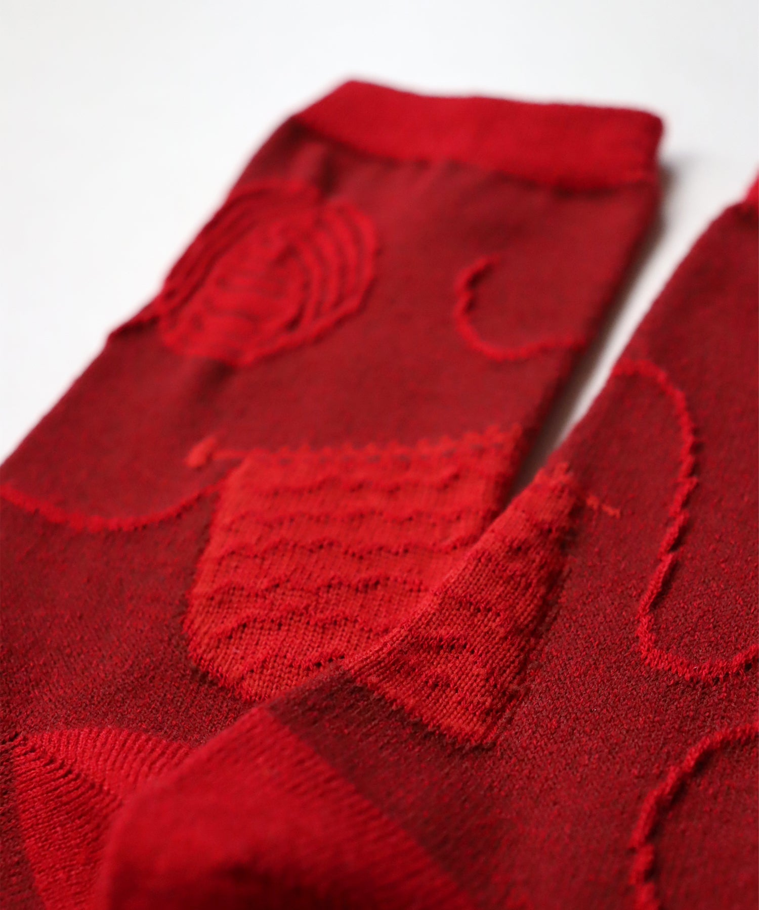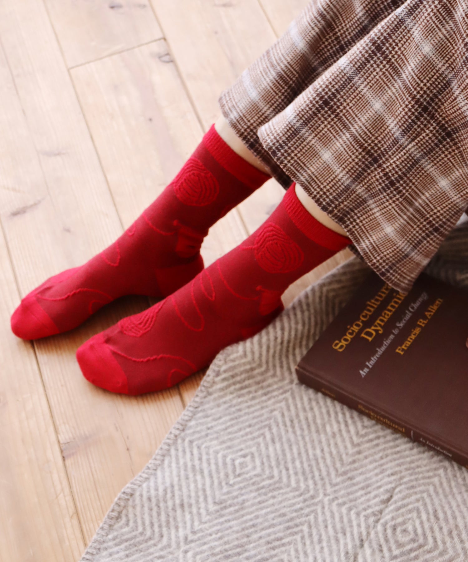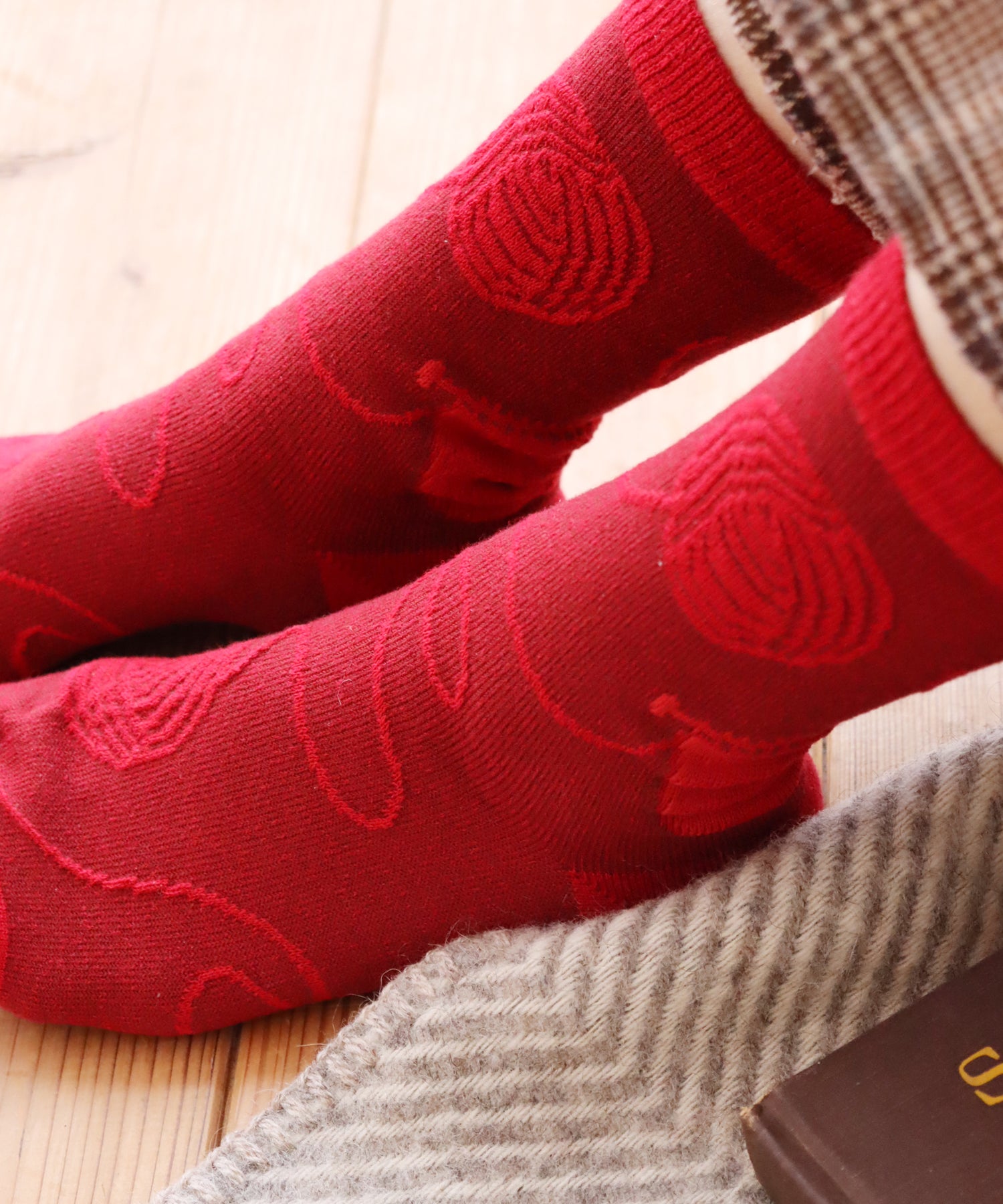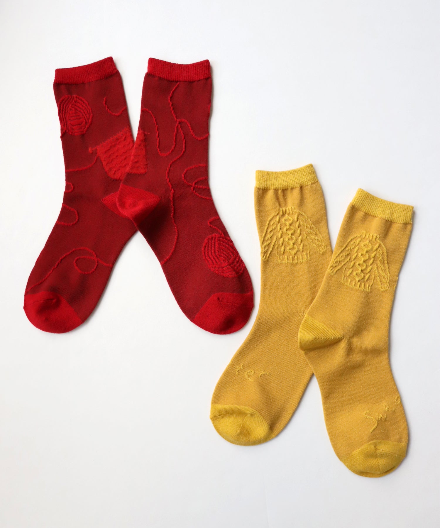 立体的な編み柄が目を引く、遊び心のあるデザインソックス。毛糸玉や手編みのセーターをモチーフに、季節感をさりげなく取り入れました。