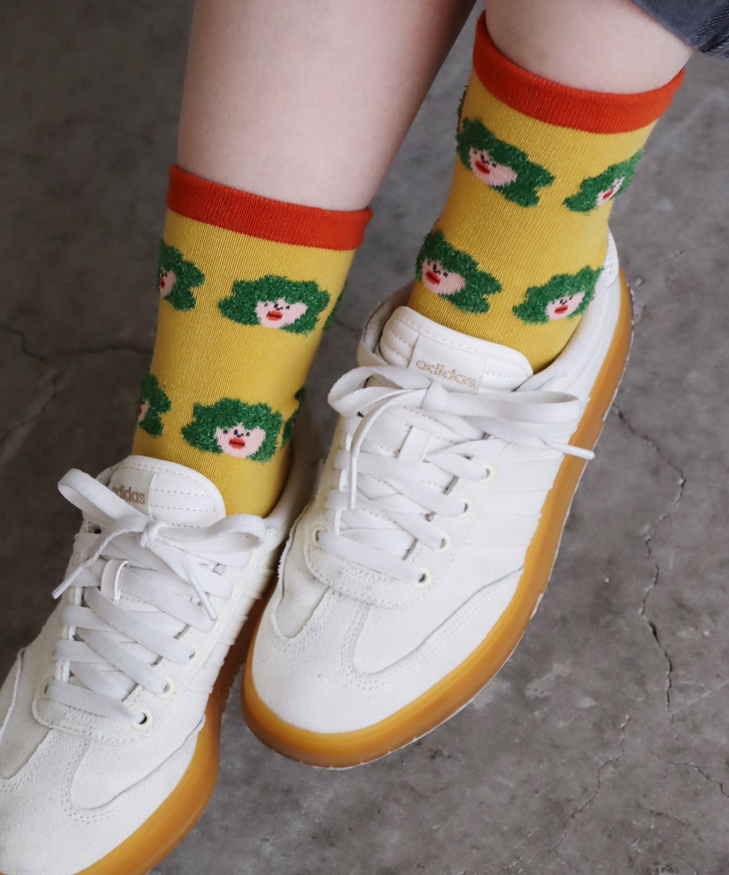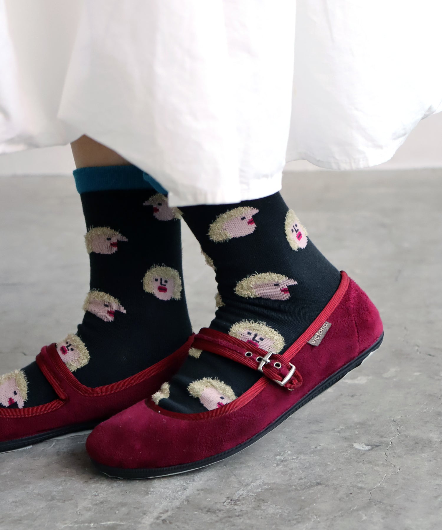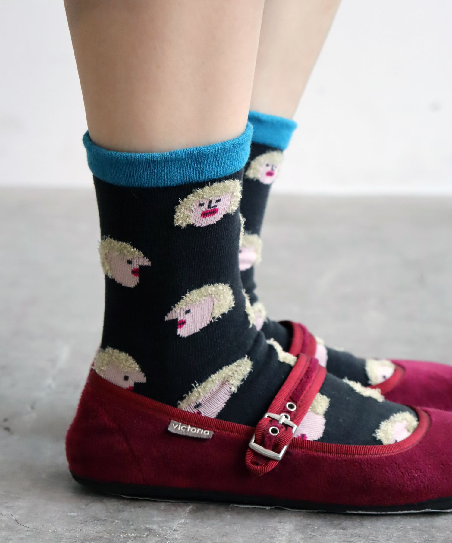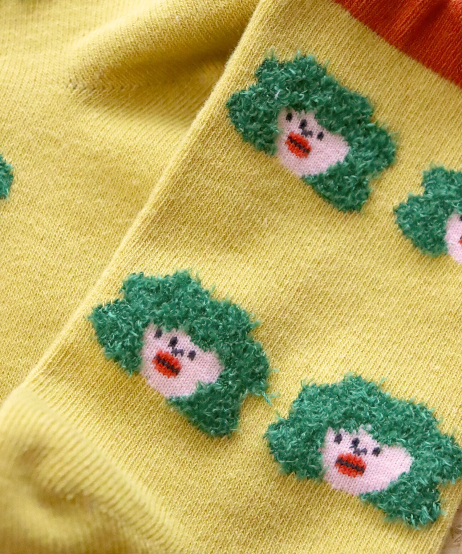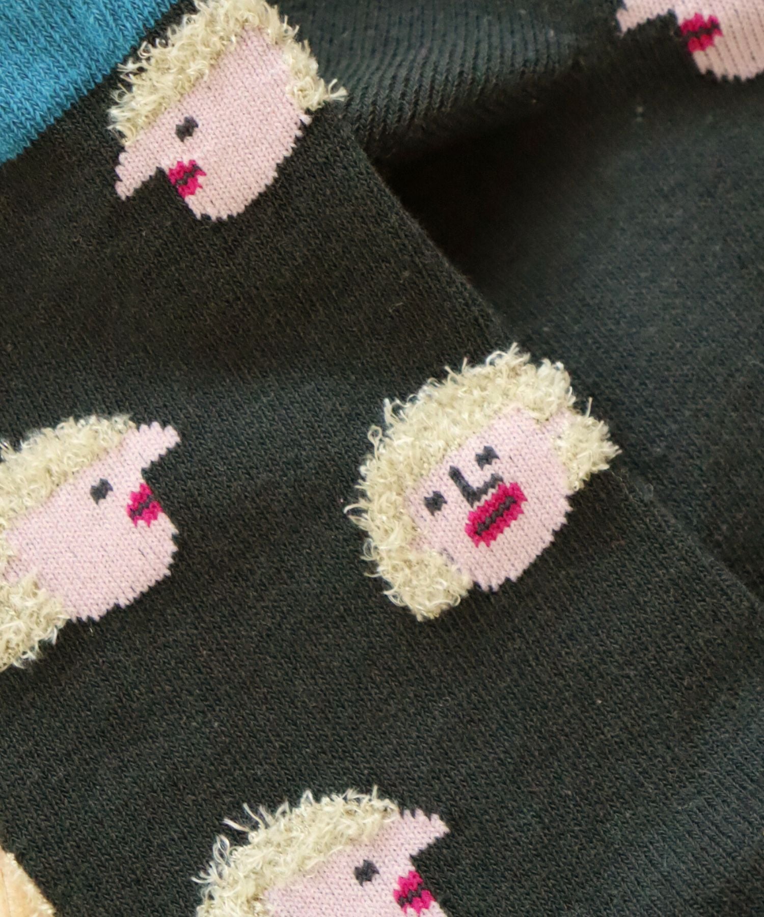 髪がふさふさな女の子たちがぎっしり並んだ、ユニークな総柄ソックス🧦スカートからちらっと見えるだけでも、ちょっと目を引くデザインです。履くだけで遊び心たっぷりのコーデに✨履き口は柔らかく編みたてています◎