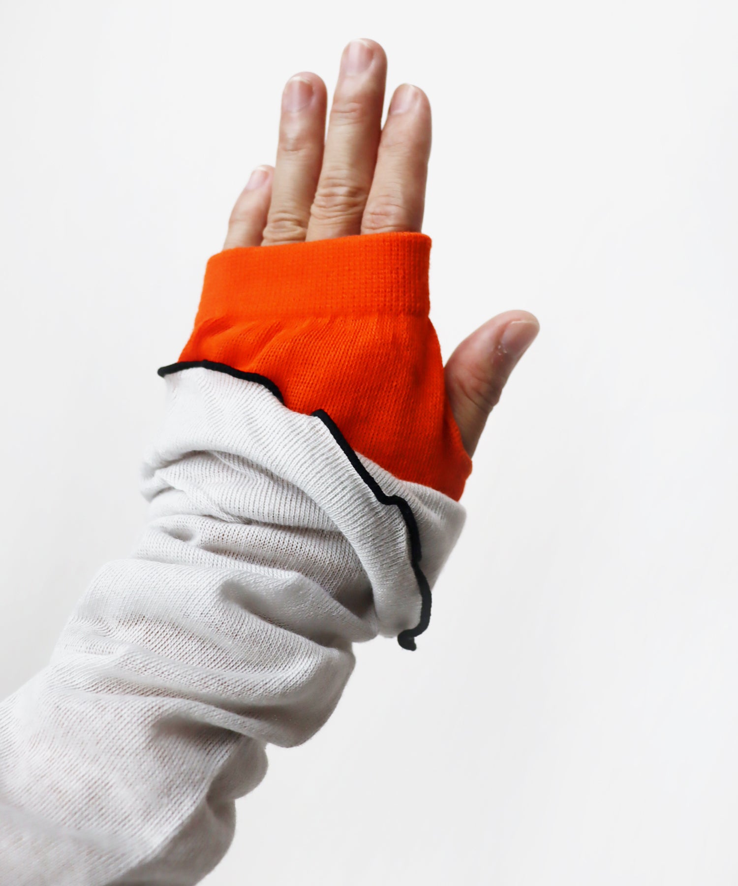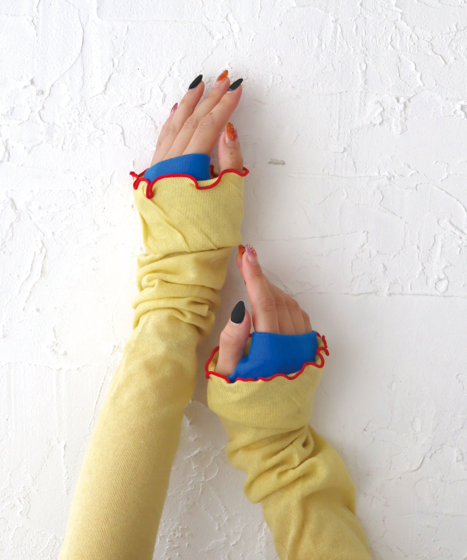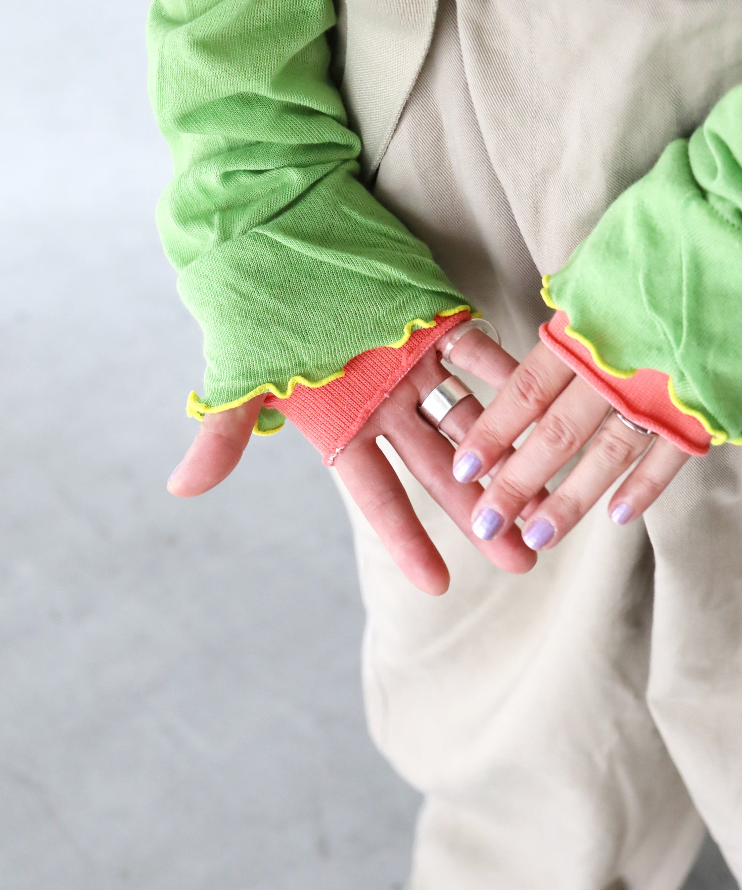 内側親指部分に指穴を開けているので、手の甲までしっかり覆うことが可能です。裾にメロウがあることで、手首で使う場合もおしゃれにキマります◎