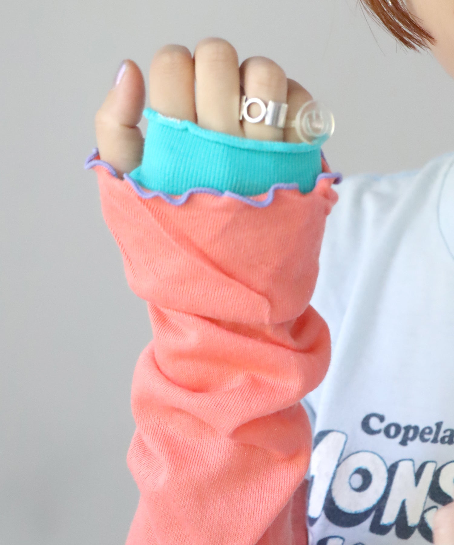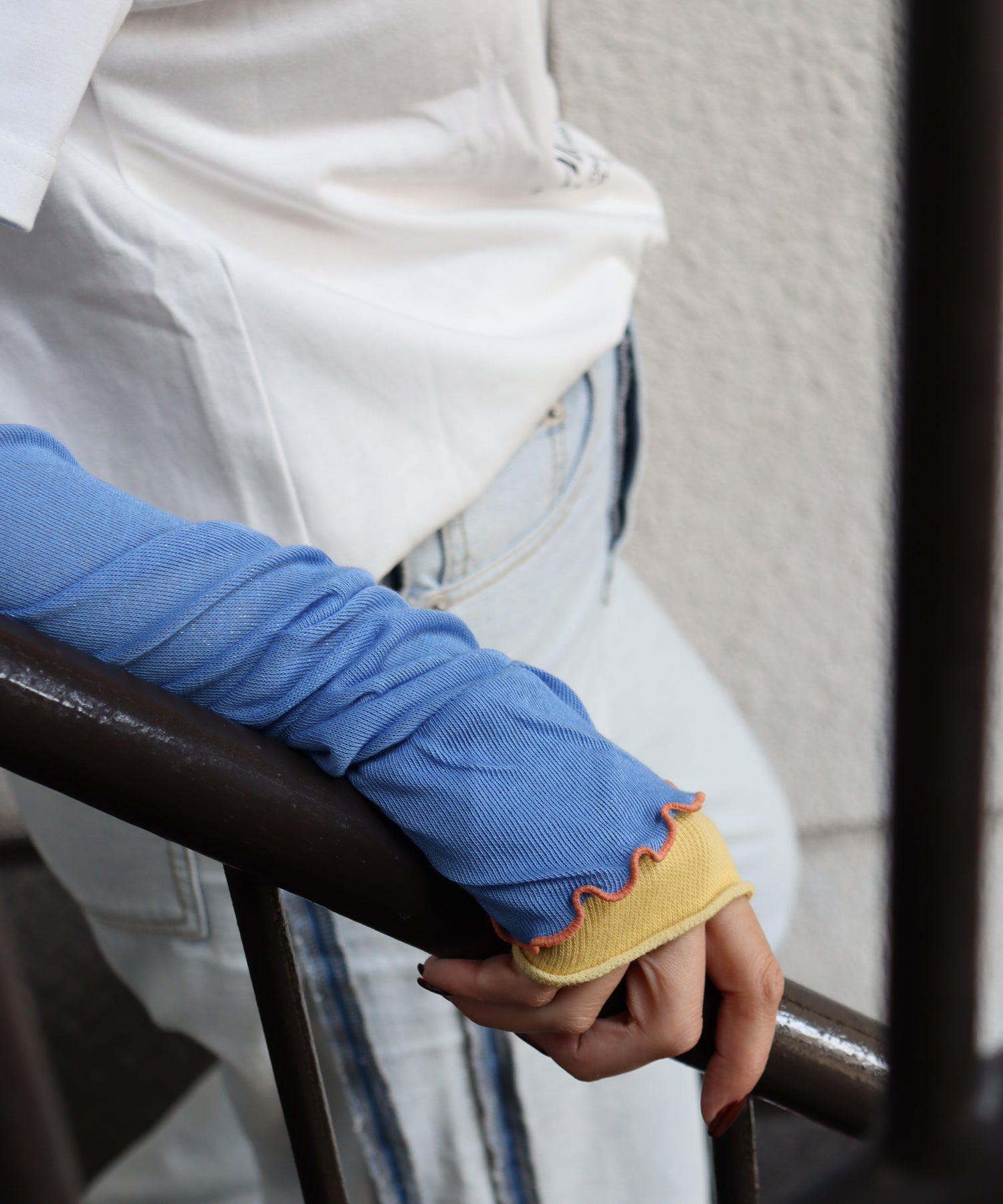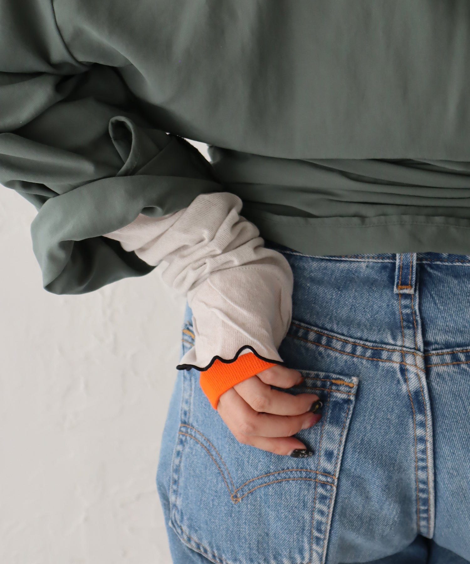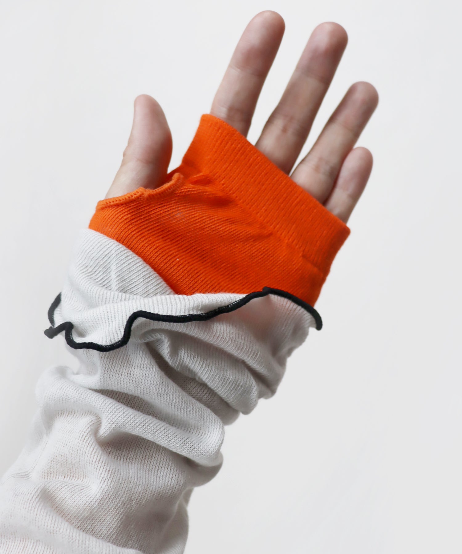 内側親指部分に指穴を開けているので、手の甲までしっかり覆うことが可能です。裾にメロウがあることで、手首で使う場合もおしゃれにキマります◎