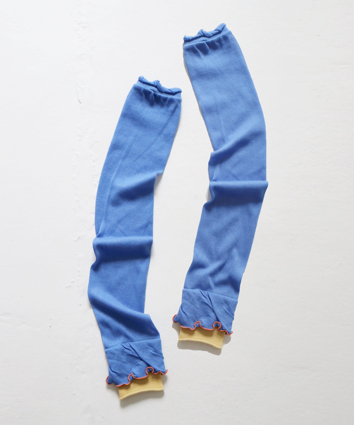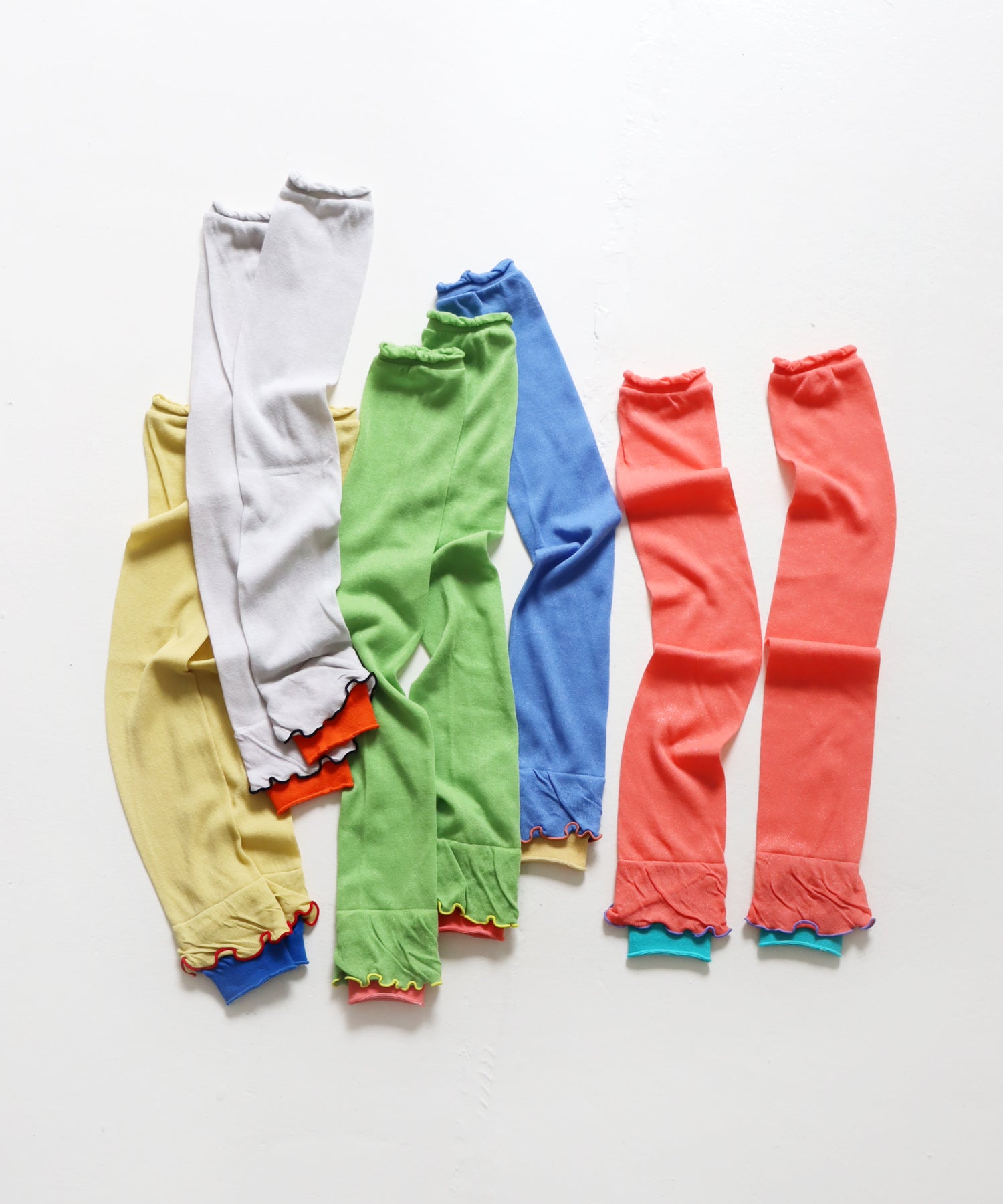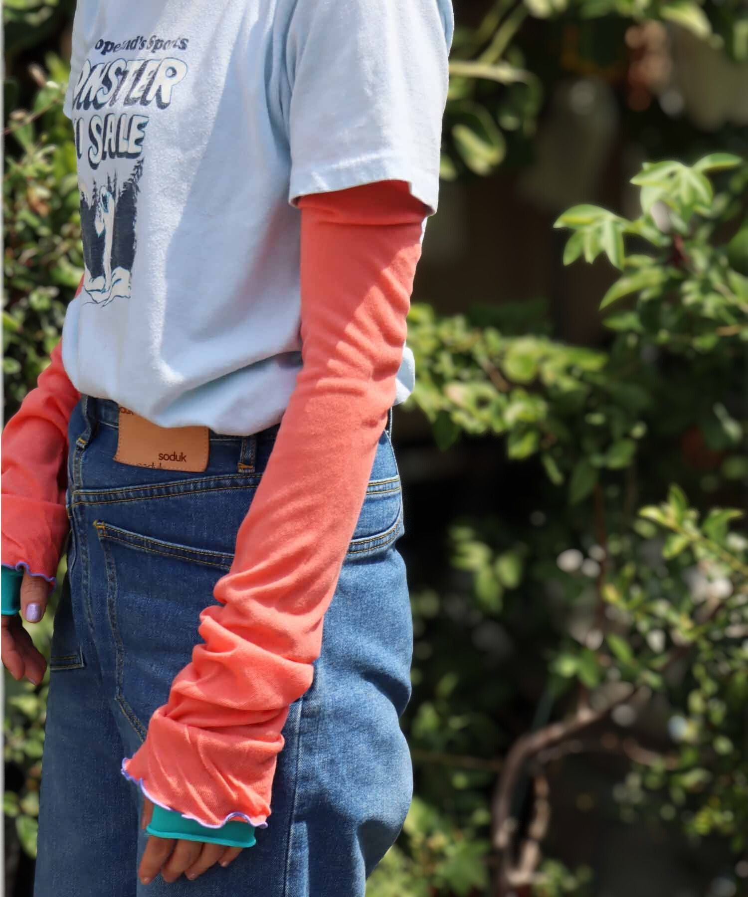 色使いや花びらのようなシルエットがかわいいアームカバーが登場しました。綿糸を使ってゆるめに編みたてているのでピタっとし過ぎないようにしています。すこし長めなので二の腕までつけられるし、くしゅっとつけてもOK!お好みに合わせてお使いいただけます。