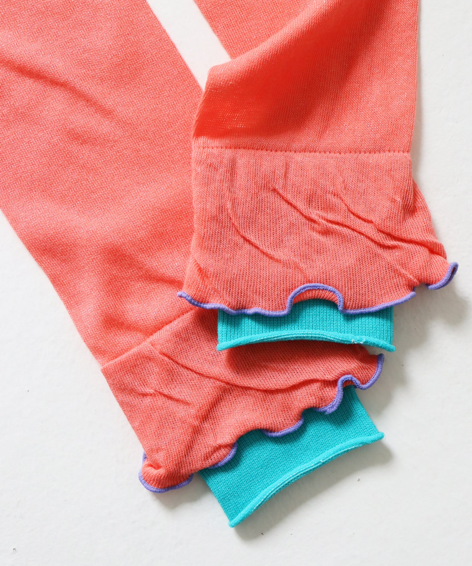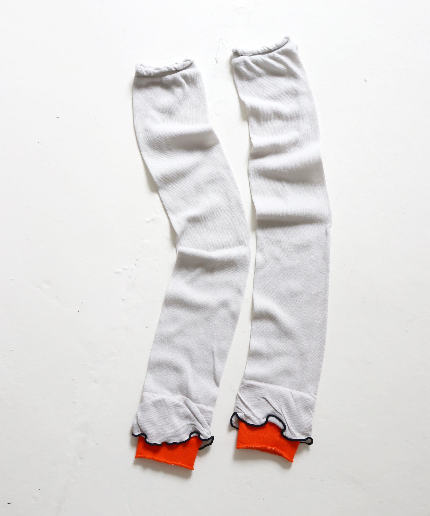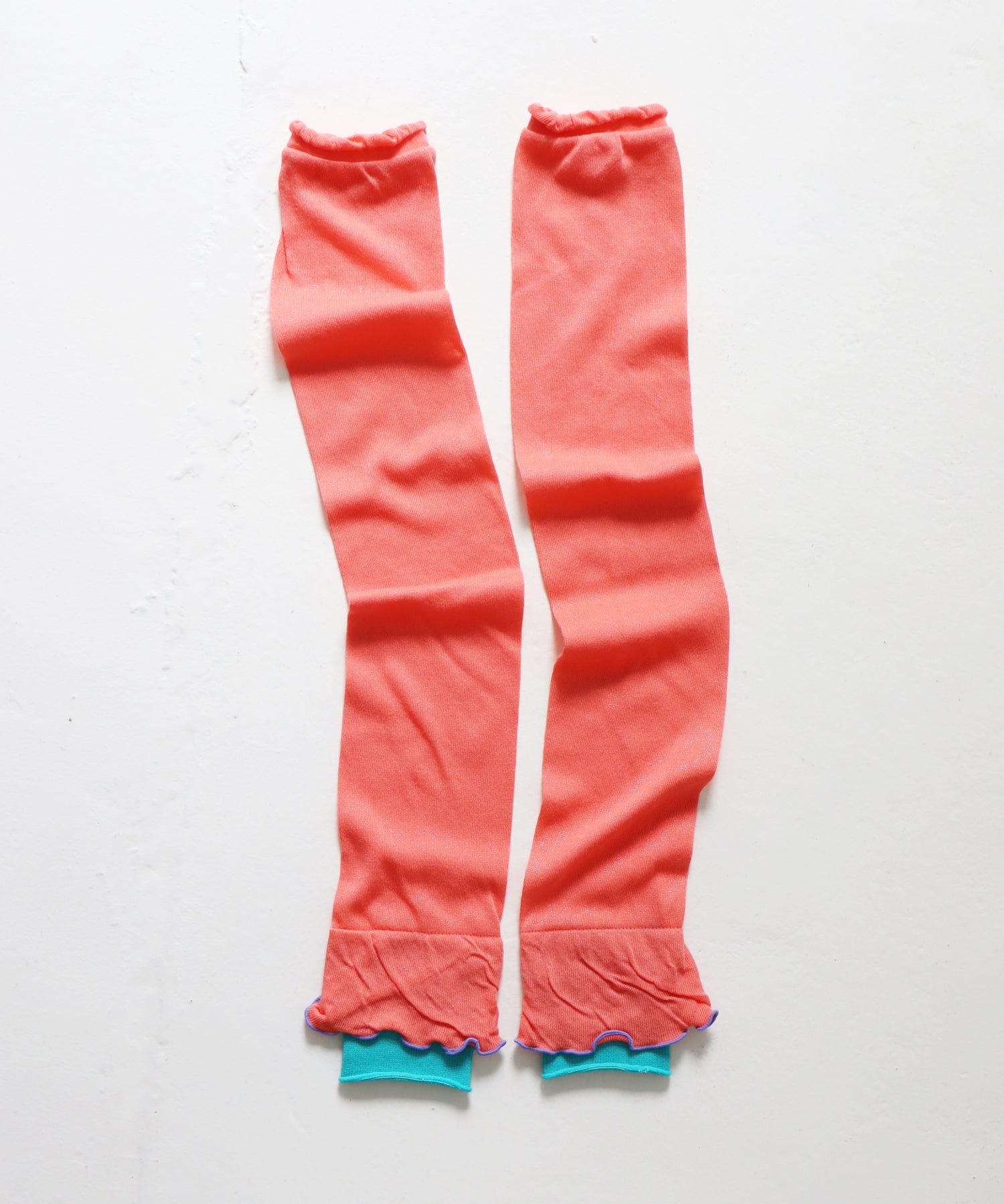 色使いや花びらのようなシルエットがかわいいアームカバーが登場しました。綿糸を使ってゆるめに編みたてているのでピタっとし過ぎないようにしています。すこし長めなので二の腕までつけられるし、くしゅっとつけてもOK!お好みに合わせてお使いいただけます。
