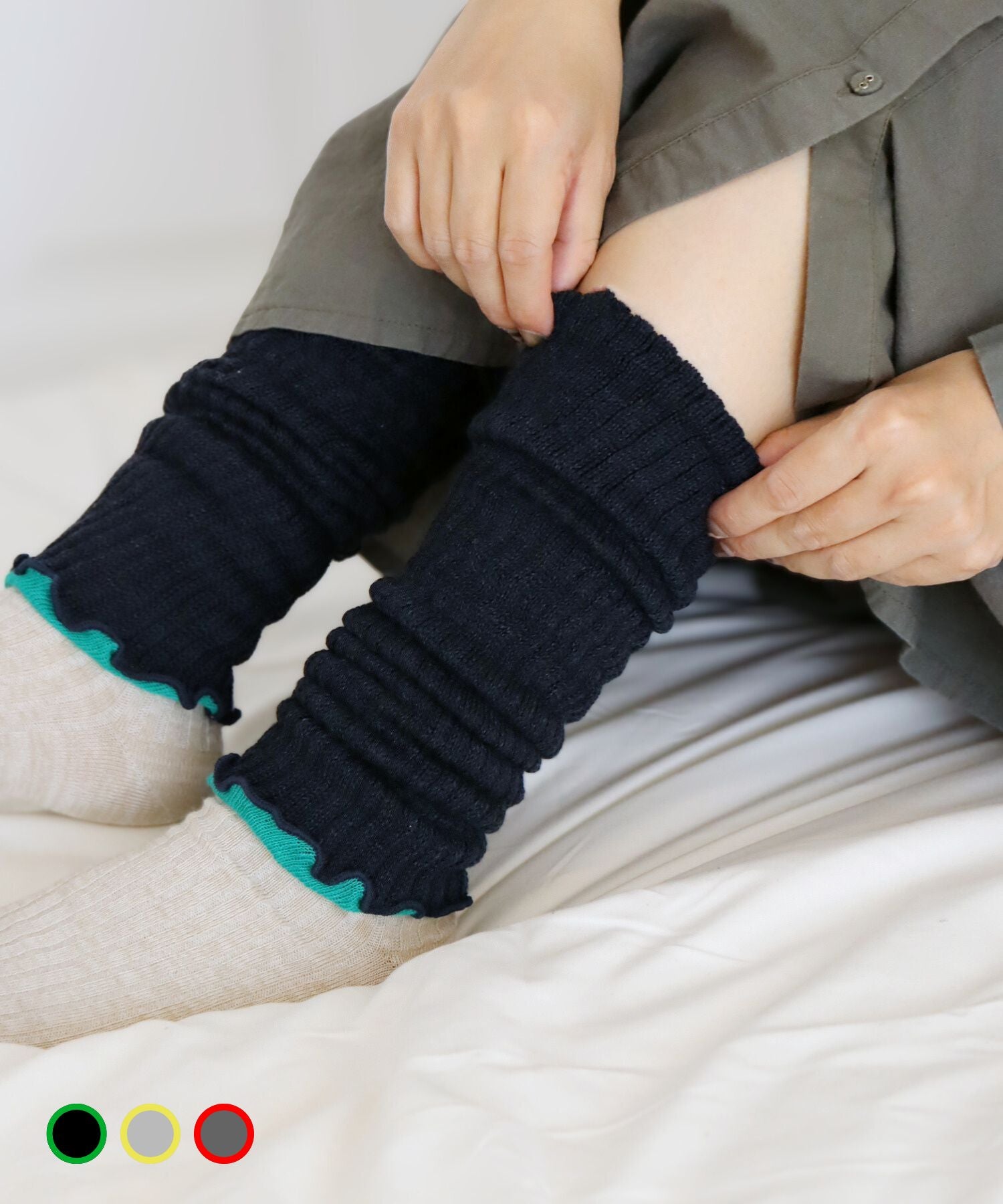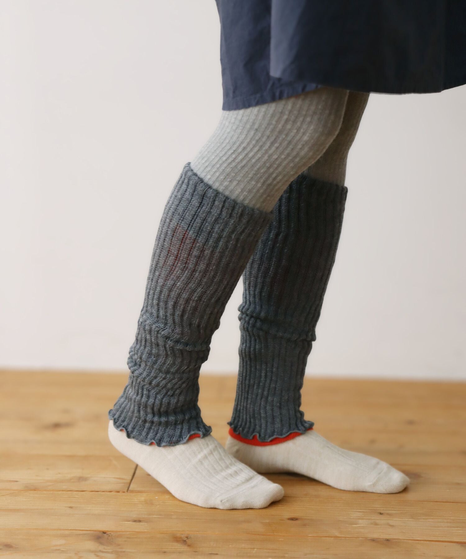 レッグウォーマーにもアームウォーマーにもなる2WAYウォーマー。内側がコットン100%の2重編み構造でできているので肌触りも良く、保温力抜群です。工場で限界までゆるく編んでもらうことで大きくゆるくなり、そのままでは緩すぎて使いにくい為、ゴムをいれて大きなものをぎゅっとしているなので付け心地がフワフワになっています。見た目はナチュラルな印象になりすぎないよう内側にさりげない配色をいれることによって家でも外でも様々なシーンで活躍してくれます。